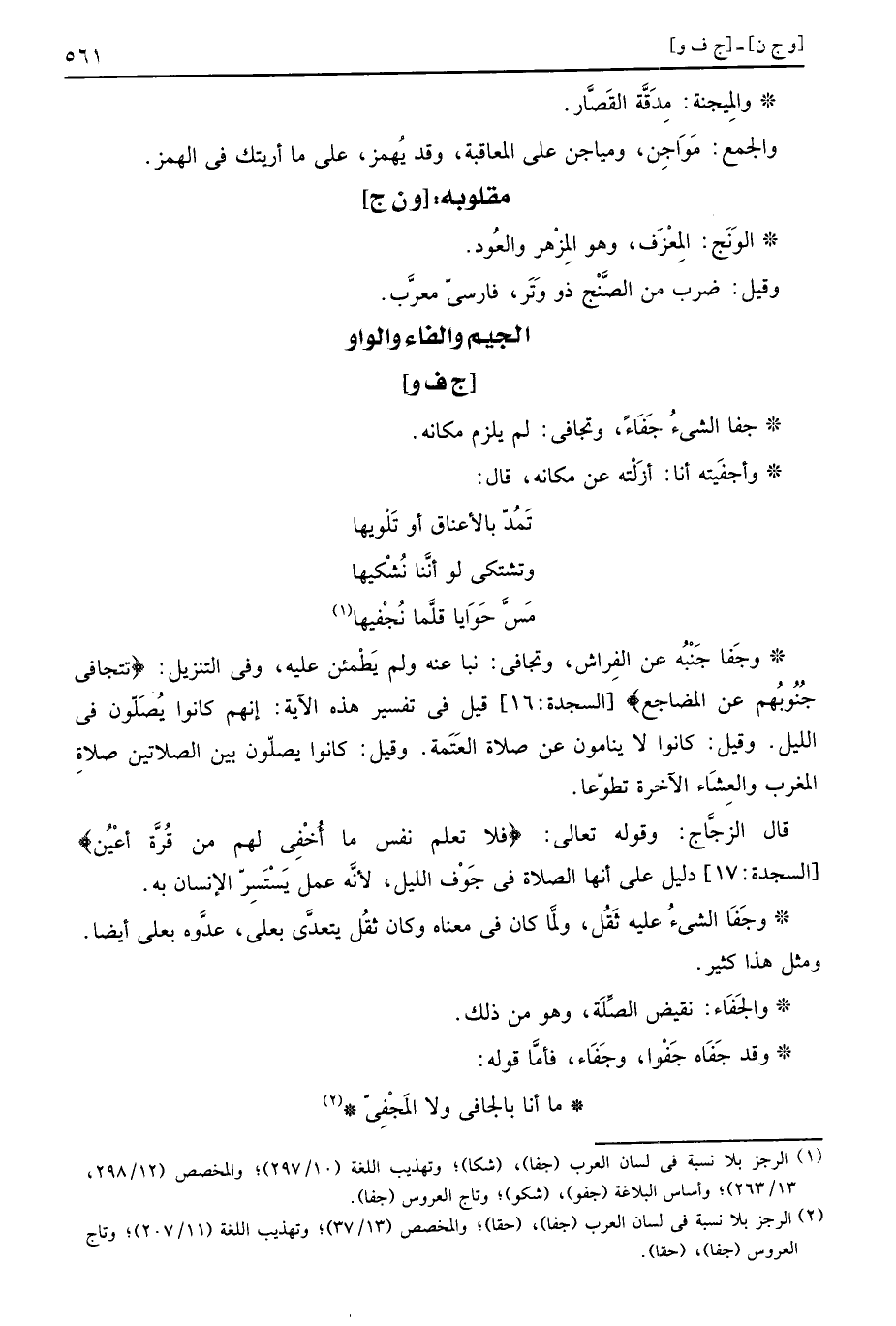 وجَفا جنبه عَن الْفراش، وتجافى: نبا عَنهُ وَلم يطمئن عَلَيْهِ، وَفِي التَّنْزِيل: (تَتَجَافَى جُنُوبُهم عَن الْمضَاجِع) قيل فِي تَفْسِير هَذِه الْآيَة: إِنَّهُم كَانُوا يصلونَ فِي اللَّيْل. وَقيل: كَانُوا لَا ينامون عَن صَلَاة الْعَتَمَة. وَقيل: كَانُوا يصلونَ بَين الصَّلَاتَيْنِ صَلَاة الْمغرب وَالْعشَاء الْآخِرَة تَطَوّعا.
