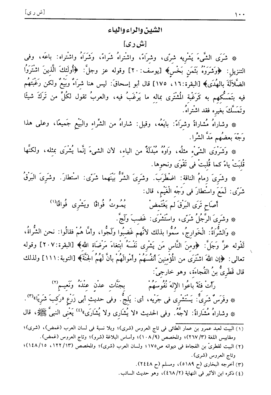 شَرَى الشَّيءَ يَشْرِيه شِرًى وشِرَاءً واشْتراهُ شَراءً وشَرَاهُ واشْتراه باعَه وفي التنزيل {وشروه بثمن بخس} يوسف 20 وقوله عز وجلَّ {أولئك الذين اشتروا الضلالة بالهدى} البقرة 16 175 قال أبو إسحاقَ ليس هنا شِرَاءٌ وبَيْعٌ ولكن رَغْبَتهُم فيه بتَمَسُّكِهِم به كَرَغْبَةِ المُشْتَري بمالِهِ ما يَرْغَبُ فيه والعربُ تقول لكُلِّ من تَرَكَ شيئًا وتَمَسَّكَ بغيرِه فقد اشْتراهُ وشاراهُ مُشاراةً وشِرَاءً بايَعُه وقيل شاراهُ من الشِّراءِ والبَيْعِ جَميعاً وعلى هذا وَجّهَ بعضُهم مَدَّ الشِّرا وَشَرْوَى الشّيْءِ مثلُه وَاوُهُ مُبْدَلَةٌ من الياءِ لأن الشيءَ إنَّما يُشْرَى بِمثله ولكنَّها قُلِبَتْ ياءً كما قُلِبتْ في تَقْوَى ونحوِها وشَرِيَ زِمامُ الناقةِ اضْطَرَبَ وشَرِيَ الشَّرُّ بَيْنَهما شَرًى اسْتطارَ وشَرِيَ البَرْقُ شَرًى لَمَعَ واسْتطارَ في وَجْهِ الغَيْمِ قال
