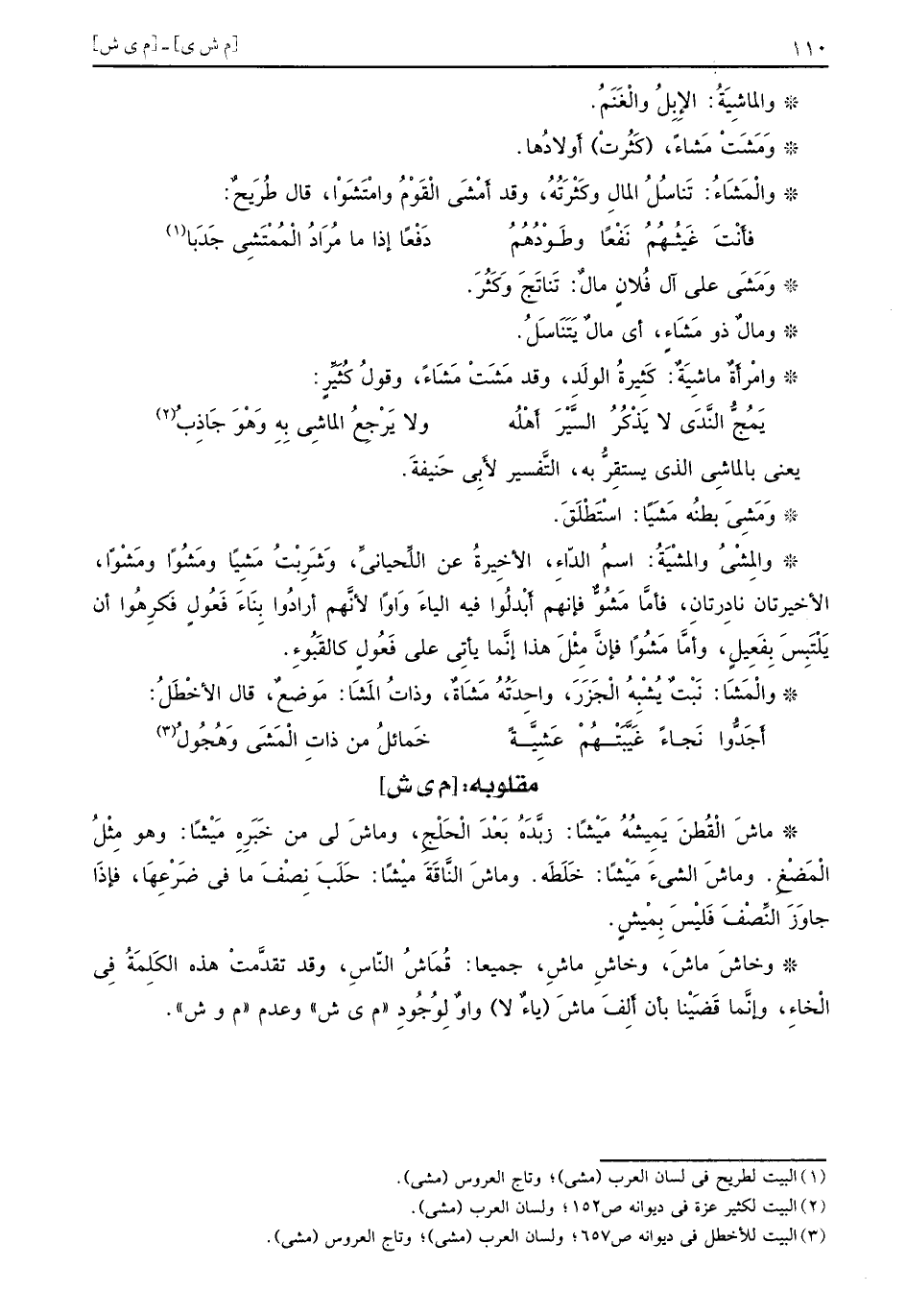 يعني بالماشِي الذي يستقِرُّ به التَّفسير لأَبِي حَنيفَة وَمَشَى بطنُه مَشياً اسْتَطْلَقَ والمِشْيُ والمشْيَةُ اسمُ الدّاءِ الأخِيرةُ عن اللِّحيانيِّ وَشَرِبْتُ مَشِياً ومَشُواً ومَشْواً الأخيرتان نادِرتانِ فأمَّا مَشُوٌّ فإنهم أَبْدلُوا فيه الياءَ وَاواً لأنَّهم أرادُوا بِنَاءَ فَعُولٍ فَكِرهُوا أن يَلْتَبِسَ بِفَعِيلٍ وأمَّا مَشُواً فإنَّ مِثْلَ هذا إنَّما يأتِي على فَعُولٍ كالقَبُوءِ والْمَشَا نَبْتٌ يُشْبِهُ الْجَزَرَ واحِدَتُهُ مَشَاةٌ وذاتُ المَشَا مَوضعٌ قال الأَخْطَلُ