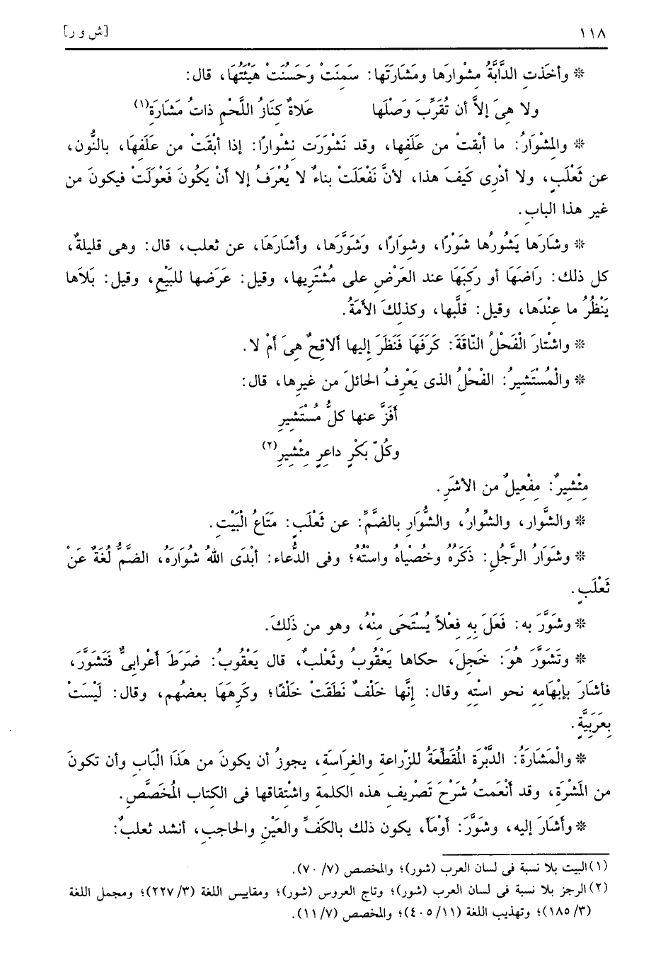 والمِشْوَارُ ما أبْقتْ من عَلَفِها وقد نَشْوَرَت نِشْواراً إذا أبْقَتْ من عَلَفِهَا بالنُّون عن ثَعْلَبٍ ولا أدْرِي كَيفَ هذا لأنَّ نَفْعَلَتْ بناءٌ لا يُعْرَفُ إلا أنْ يَكُونَ فَعْوَلَتْ فيكونَ من غير هذا البابِ وشَارَها يَشُورُها شَوْراً وشِوَاراً وَشَوَرَّهَا وأَشَارَهَا عن ثعلب قال وهي قليلةٌ كل ذلك رَاضَهَا أو رَكِبَهَا عند العَرْضِ على مُشْتَرِيها وقيل عَرَضها للبَيْعِ وقيل بَلاَهَا يَنْظُرُ ما عِنْدَها وقيل قلَّبها وكذلِكَ الأَمَةُ واشْتارَ الْفَحْلُ النّاقَةَ كَرَفَهَا فَنَظَرَ إِليها أَلاقِحٌ هِيَ أَمْ لا والْمُسْتَشِيرُ الفْحْلٌ الذي يَعْرِفُ الحائلَ من غيرِها قال