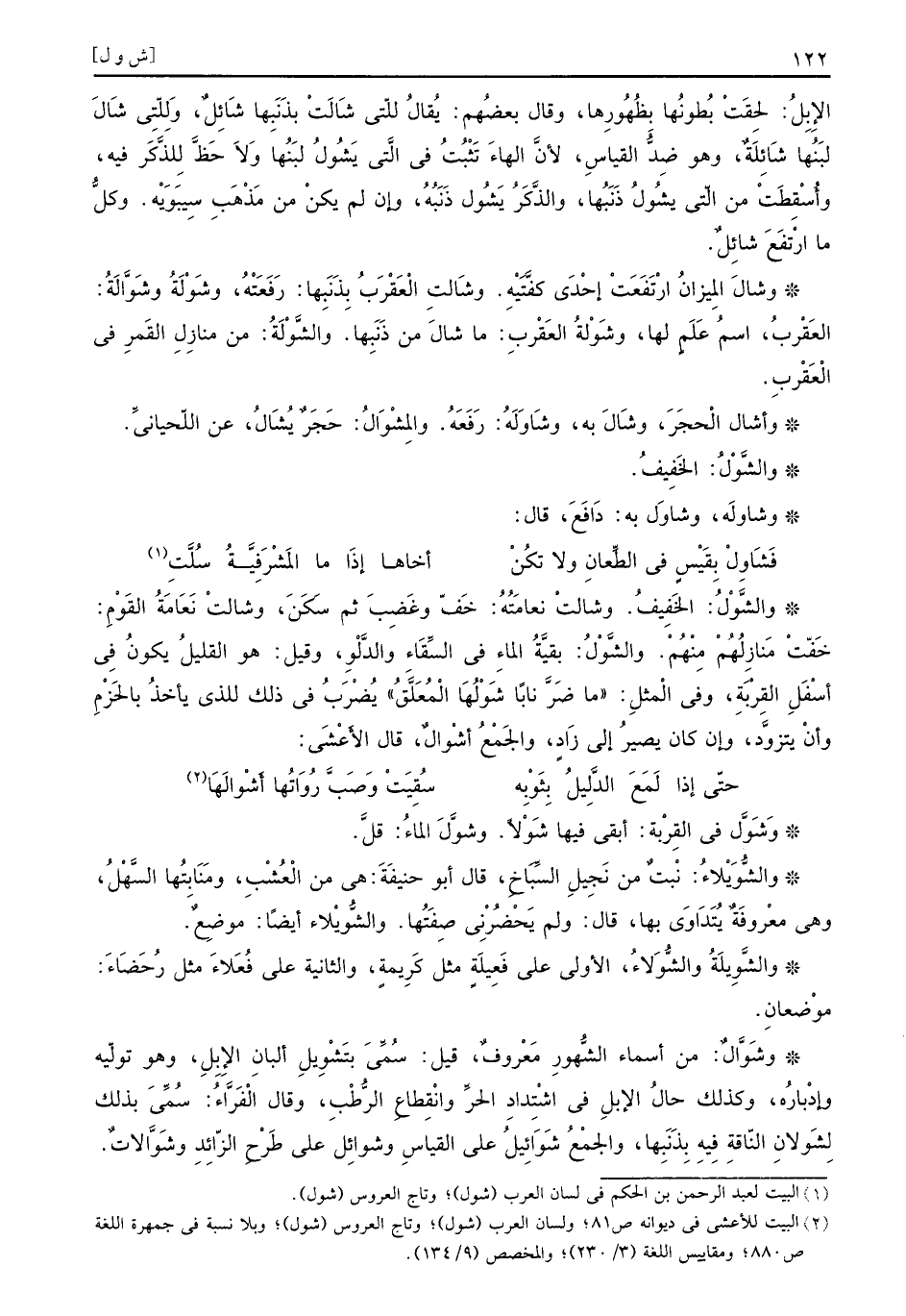 الإِبِلِ لحِقَتْ بُطونُها بِظُهُورِها وقال بعضُهم يُقالُ للّتي شَالَتْ بذَنَبِها شَائِلٌ وَلِلّتِي شَالَ لبَنُها شَائِلَةٌ وهو ضِدُّ القياسِ لأنَّ الهاءَ تَثْبُتُ في الَّتي يَشُولُ لبَنُها وَلاَ حَظَّ لِلذَّكَرِ فيه وأُسْقِطَتْ من الّتي يشُولُ ذَنَبُها والذَّكَرُ يَشُول ذَنَبُهُ وإن لم يكنْ من مَذْهَبِ سِيبَوَيْه وكلُّ ما ارْتَفَعَ شائِلٌ وشالَ المِيزانُ ارْتَفَعَتْ إحْدَى كفَّتَيْهِ وشَالتِ الْعَقْرَبُ بِذَنَبِها رَفَعَتْهُ وشَوْلَةُ وشَوَّالَةُ العَقْربُ اسمُ عَلَمٍ لها وشَوْلَةُ العَقْربِ ما شالَ من ذَنَبِها والشَّوْلَةُ من منازِلِ القَمرِ في الْعَقْربِ وأشال الْحجَرَ وشَالَ به وشَاوَلَهُ رَفَعَهُ والمِشْوَالُ حَجَرٌ يُشَالُ عن اللّحيانيِّ والشَّوْلُ الخَفِيفُ وشاولَه وشاوَل به دَافَعَ قال