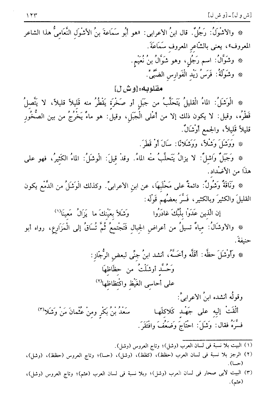 الْوَشَلُ الماءُ الْقليلُ يَتَحَلَّبُ من جَبَلٍ أو صَخْرَةٍ يَقْطُرُ منه قَلِيلاً قليلاً لا يَتَّصِلُ قَطْرُه وقيل لا يكون ذلك إلا من أَعْلى الْجَبَلِ وقيل هو ماءٌ يَخْرُجُ من بين الصُّخُورِ قليلاً قليلاً والجمع أَوْشَالٌ وَوَشَلَ وَشْلاً وَوَشَلاناً سَالَ أَوْ قَطَرَ وَجَبَلٌ وَاشِلٌ لا يزالُ يَتَحَلَّبُ منه الماءُ وقدْ قِيلَ الْوشَلُ الماءُ الكَثِيرُ فهو على هذا من الأَضْدادِ وَنَاقَةٌ وَشُولٌ دائمةٌ على مَحْلَبِهَا عن ابنِ الأعرابيِّ وكذلك الْوَشَلُ من الدَّمْع يكون القليلَ والكثيرَ وبالكثير فَسَّرَ بعضُهم قَوْلَه