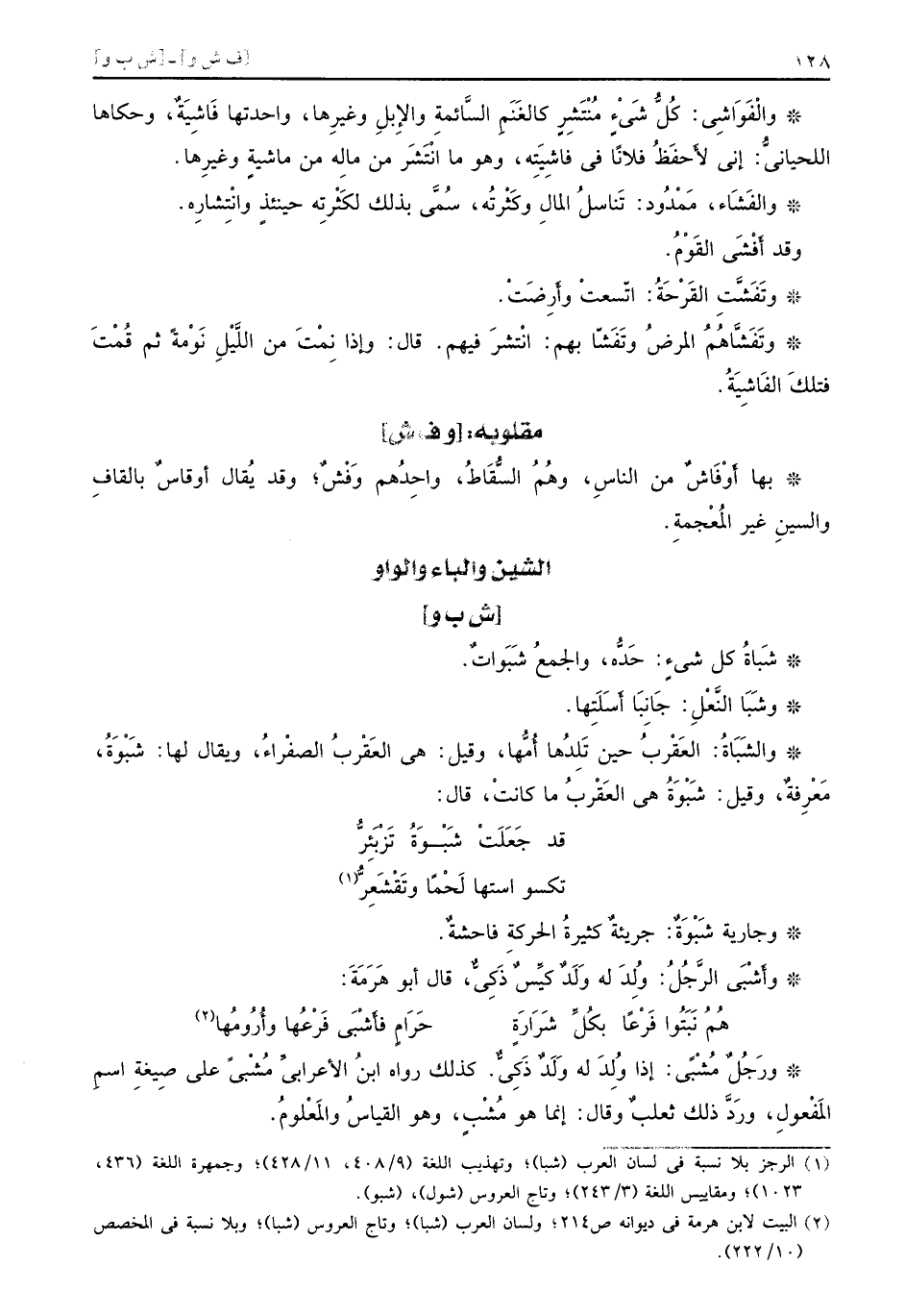 والْفَوَاشِي كُلُّ شَيْءٍ مُنْتَشِرٍ كالغَنَمِ السَّائمة والإِبِلِ وغيرِها واحدتها فَاشِيَةٌ وحكاها اللحيانيُّ إني لأحفَظُ فلاناً في فاشِيَتِه وهو ما انْتَشَرَ من مالِه من ماشيةٍ وغيرِها والفَشَاء مَمْدُود تَناسلُ المالِ وكَثْرُته سُمَّى بذلك لكَثْرتِه حينئذٍ وانْتِشارِه وقد أَفْشَى القَوْمُ وتَفَشَّتِ القَرْحَةُ اتّسعتْ وأَرِضَتْ وتَفَشَّاهُمُ المرضُ وتَفَشّا بهم انْتشَر فيهم قال وإذا نِمْتَ من اللَّيْلِ نَوْمَةً ثم قُمْتَ فتلكَ الفَاشِيَةُ
