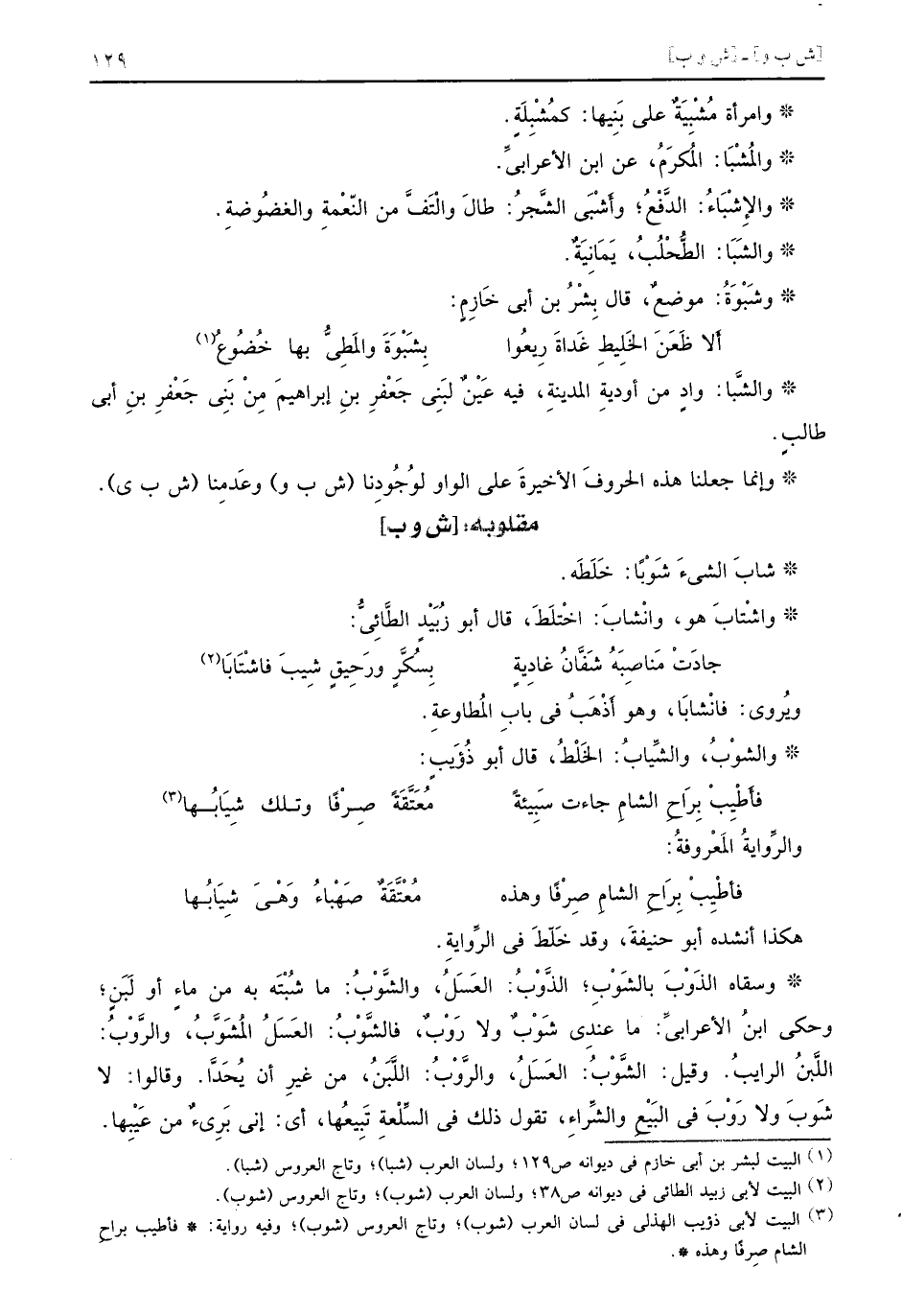 شابَ الشيءَ شَوْباً خَلَطَه واشْتابَ هو وانْشابَ اخْتلَطَ قال أبو زُبَيْدٍ الطًّائِيُّ