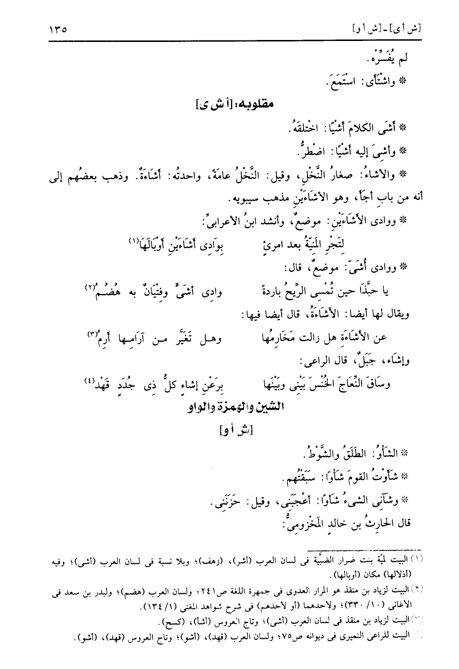 أشَى الكلامَ أَشْياً اخْتلقَهُ وأشِيَ إليه أَشْياً اضْطرُّ والأشاءُ صغارُ النَّخْلِ وقيل النَّخْلُ عامَةً واحدتهُ أَشَاءَةٌ وذهب بعضُهم إلى أنه من بابِ أَجَأَ وهو الأَشَاءَيْنِ مذهب سيبويه ووادي الأَشَاءَيْنِ موضعٌ وأنشد ابنُ الأعرابيِّ