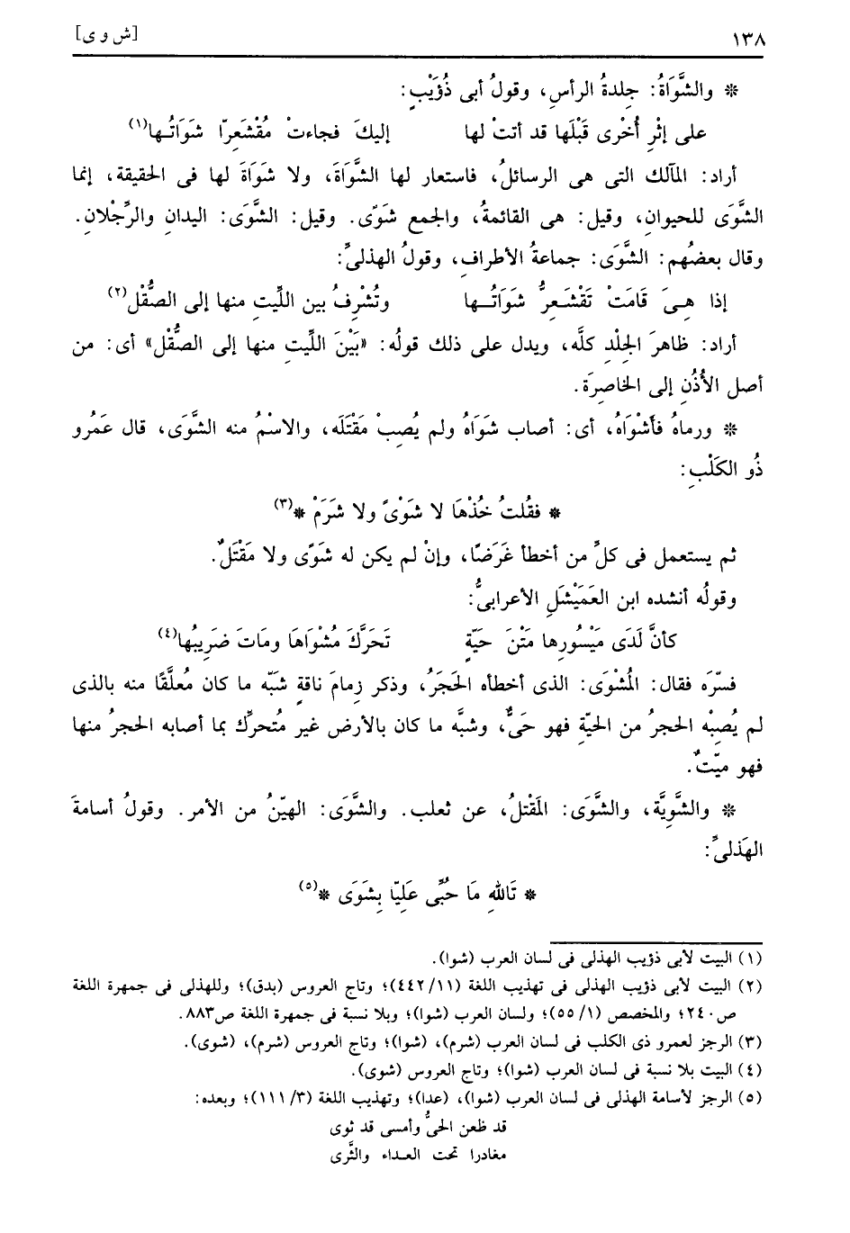 فسّرَه فقال المُشْوَى الذي أخطأه الحَجَرُ وذكر زِمامَ ناقةٍ شَبّه ما كان مُعلَّقاً منه بالذي لم يُصِبْه الحجرُ من الحيّةِ فهو حَيٌّ وشبَّه ما كان بالأرض غير مُتحرِّك بما أصابه الحجرُ منها فهو ميّتٌ والشَّوِيَّة والشَّوَى المَقْتلُ عن ثعلب والشَّوَى الهيّنُ من الأمر وقولُ اسامةَ الهَذليُّ