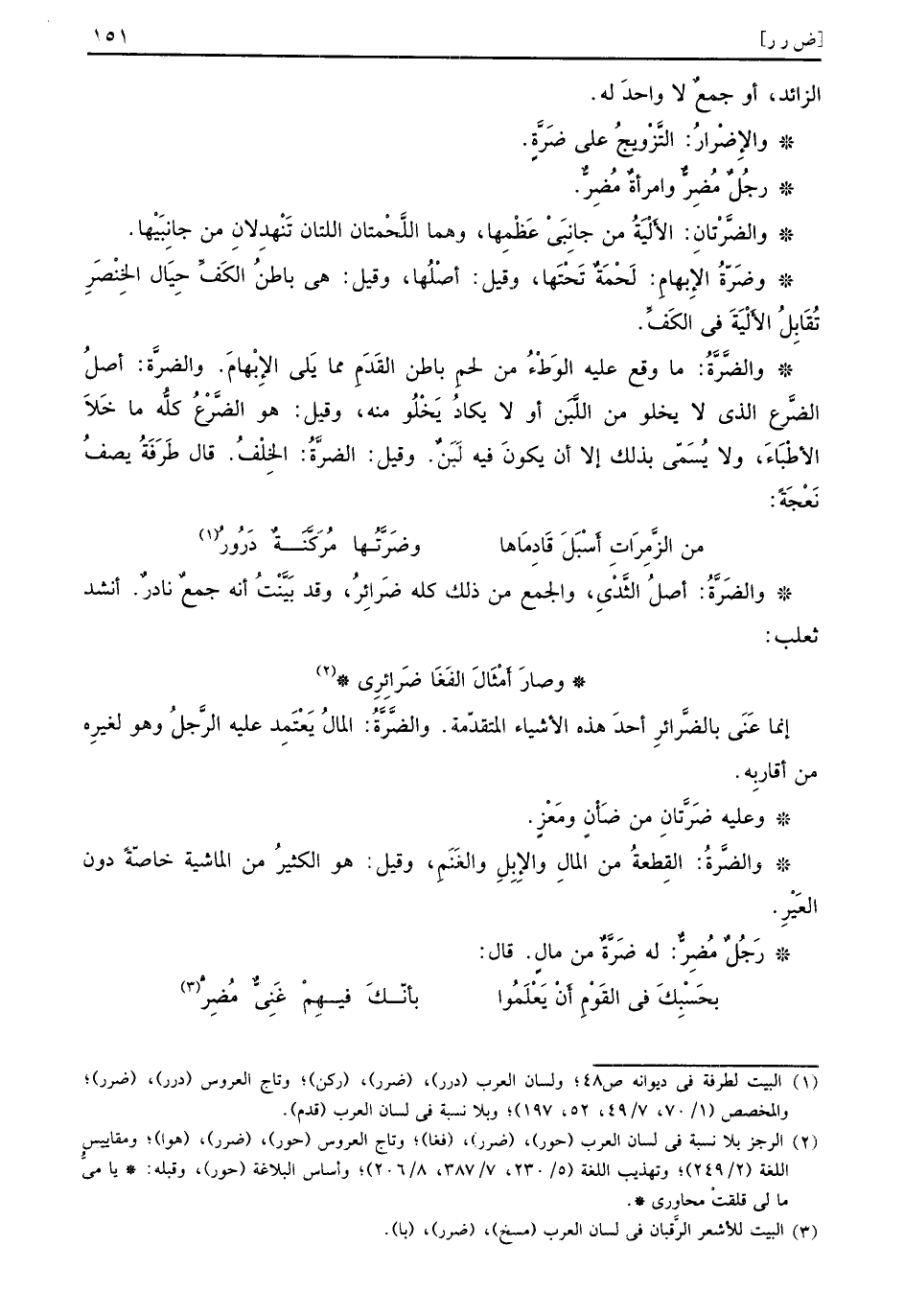 إنما عَنَى بالضَّرائرِ أحدَ هذه الأشياء المتقدّمة والضَّرَّةُ المالُ يَعْتَمِد عليه الرَّجلُ وهو لغيرِه من أقاربِه وعليه ضَرَّتانِ من ضَأْنٍ ومَعْزٍ والضَّرةُ القِطعةُ من المالِ والإِبِلِ والغَنَمِ وقيل هو الكثيرُ من الماشية خاصّةً دون العَيْرِ رَجُلٌ مُضِرٌّ له ضَرَّةٌ من مالٍ قال