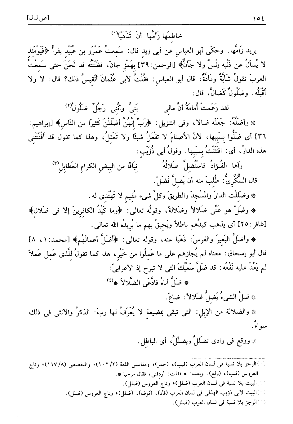 قال السُّكَّرِيُّ طُلِبَ منه أن يَضِلَّ فَضَلَ وضَلِلْتُ الدارَ والمَسْجِدَ والطريقَ وكلَّ شيء مُقِيمٍ لا تَهْتَدِي له وضَلَ هو عَنِّي ضَلالاً وضَلالةً وقولُه تعالى {وما كيد الكافرين إلا في ضلال} غافر 25 أي يذهب كيدهم باطلاً ويحيق بهم ما يريده الله تعالى وأضل البعير والفرس ذَهَبا عنه وقوله تعالى {أضل أعمالهم} محمد 1 8 قال أبو إسحاق معناه لم يُجازِهم على ما عَمِلُوا من خَيْرٍ هذا كما تقولُ لِلَّذي عَمِل عَملاً لم يَعُدْ عليه نَفْعُه قد ضَلَّ سَعْيُكَ التي لا تبرح إذ الأعرابيّ