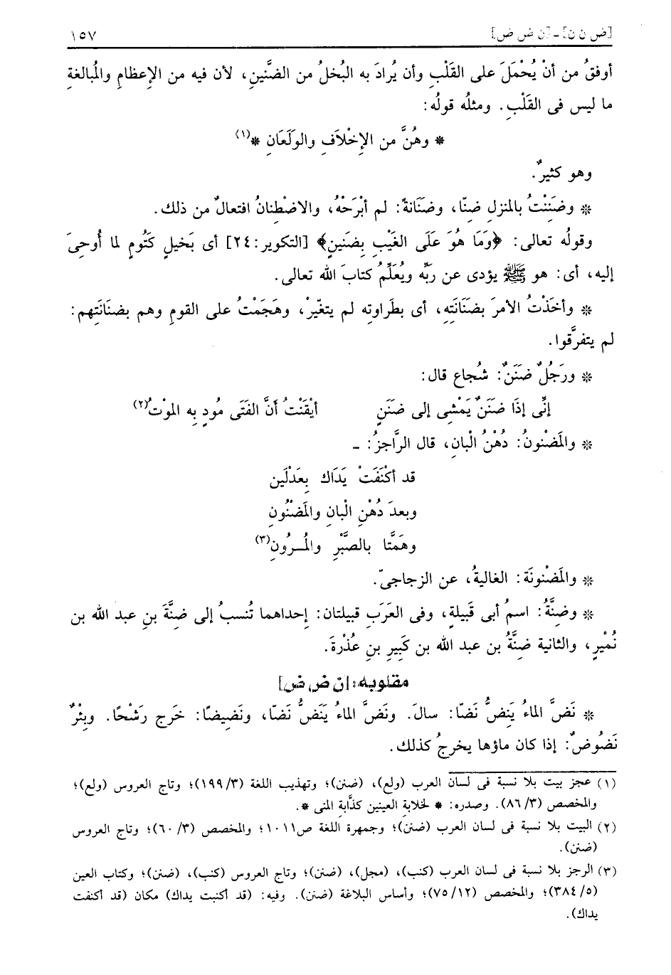 والمضمون دهن البان قال الراجز قد أكنفت يداك بعدلين وبعد دهن البان والمضمون وهمتا بالصبر والمرون والمَضْنونَة الغاليةُ عن الزجاجيّ وضِنَّهُ اسمُ أبي قَبيلةٍ وفي العَرَبِ قبيلتان إِحداهما تُنسبُ إلى ضِنَّةَ بنِ عبد الله بن نُميرٍ والثانية ضِنَّةُ بن عبد الله بن كَبِيرِ بنِ عُذْرةَ