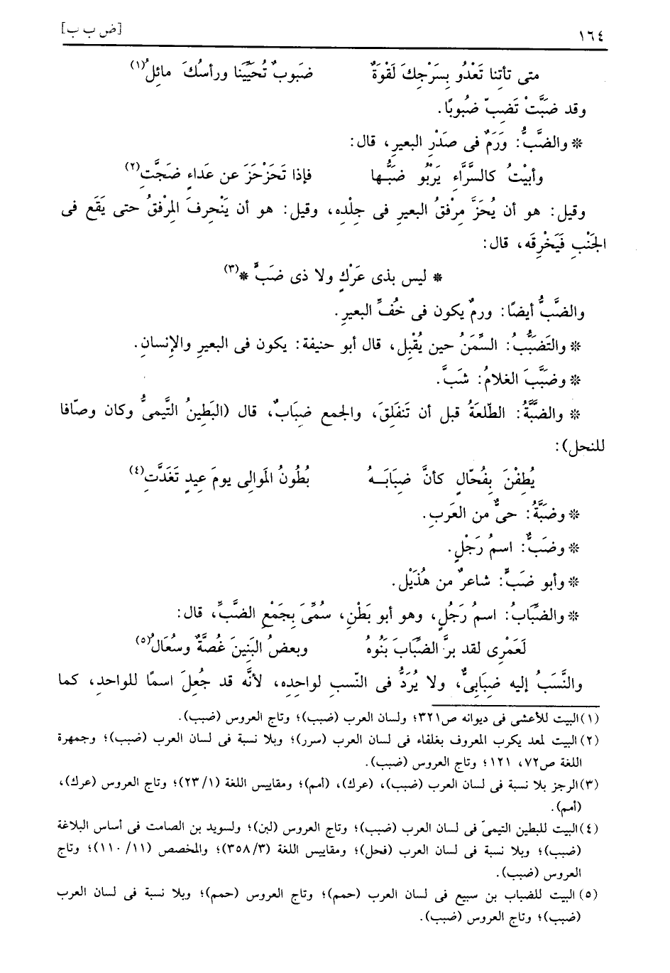 والضَّبُّ أيضاً ورمٌ يكون في خُفِّ البعيرِ والتَضَبُّبُ السِّمَنُ حين يُقْبِل قال أبو حنيفة يكون في البعيرِ والإِنسانِ وضَبَّبَ الغلامُ شَبَّ والضَّبَّةُ الطّلعَةُ قبل أن تَنِفَلقَ والجمع ضِبَابٌ قال البَطِينُ التَّيميُّ وكان وصّافا للنحل