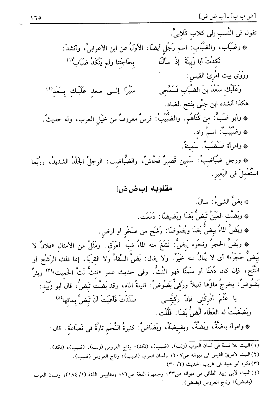 هكذا أنشده ابن جِنِّي بفتح الضادِ وأبو ضَبٌّ مِن كُنَاهُم والضُّبْيبُ فرسٌ معروفٌ من خَيْلِ العرب وله حديثٌ وضُبَيْبٌ اسمُ وادٍ وامرأة ضَبْضَبٌ سَمِينةٌ ورجل ضُبَاضِبٌ سَمِين قَصِيرٌ فَحَّاشٌ والضُّباضِب الرجلُ الجَلْدُ الشديدُ ورُبّما اسْتُعْمِلَ في البَعِيرِ