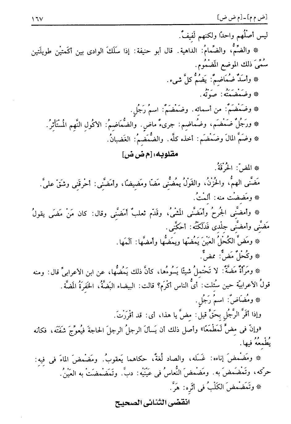 المضّ الحُرْقَةُ مَضَّني الهمُّ والحُزْنُ والقَوْلُ يمُضُّنِي مَضّا ومَضِيضاً وأمَضَّنِي أحْرقَنِي وشَقّ عليِّ ومَضِضْت منه أَلِمْتُ وأمضَّنِي الجُرحُ وأَمَضَّني المَشْيُ وقَدّم ثعلبٌ أَمَضَّنِي وقال كان مَنْ مَضَى يقول مَضَّنِي وأمضَّنِي جِلْدِ ي فَدَلَكْتُه أحَكَّنِي ومَضَّ الكُحْلُ العَيْنَ يَمُضّها ويمَضُّها وأَمضَّها آلَمَها وكُحْلٌ مَضٌّ ممضٌّ ومَرْأَةٌ مَضَّةٌ لا تَحْتمِلُ شيئاً يَسُوءُها كأنَّ ذلك يَمُضُّها عن ابن الأعرابيِّ قال ومنه قولُ الأعرابيّة حين سُئِلت أيُّ الناس أكْرَم قالت البيضاء البَضَّةُ الخَفِرَةُ المَضَّة ومُضَاضٌ اسمُ رَجُلٍ وإذا أقَرَّ الرَّجُلِ بِحَقٍّ قيل مِضَّ يا هذا أي قد أقْرَرْتَ وإنّ في مِضٍّ لَمَطْمَعاً وأصل ذلك أن يَسألَ الرجلُ الرجلَ الحاجةَ فيُعوِّجَ شَفَتَه فكأنه يُطْمِعُهُ فيها ومَضْمضَ إناءه غَسَله والصاد لُغةٌ حكاهما يَعقوبُ ومَضْمضَ الماءَ في فِيِه حرّكه وتَمْضَمضَ به ومَضْمضَ النُّعاسُ في عَيْنَيْه دبَّ وتَمَضْمضَتْ به العَيْنُ وتَمَضْمضَ الكَلْبُ في أثَرِه هَرَّ