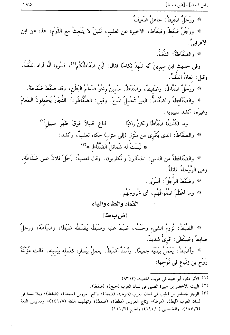 ورَجُلٌ ضَفِيطٌ جاهلٌ ضَعيفٌ ورَجُلٌ ضَفِطٌ وضَفَّاط الأخيرة عن ثعلبٍ ثَقيلٌ لا يَنْبَعِثُ مع القَوْمِ هذه عن ابن الأعرابيِّ والضَّفَاطَةُ الدُّفُّ وفي حديث ابن سِيرِينَ أنه شَهِدَ نِكاحاً فقال أيْن ضَفَاطَتُكُم فسَّروا أنَّه أراد الدُّفَّ وقيل لَعانُ الدُّفِّ ورَجُلٌ ضَفَّاطٌ وضَفيطٌ وضَفْنَطٌ سَمِينٌ رِخْوٌ ضَخْمُ البَطْنِ وقد ضَفُطَ ضَفَاطَةً والضَفَافِطةُ والضَّفَاطُّ العيرُ تَحْمِلُ المتاعَ وقيل الضَّفَّاطُون التُّجّارُ يَحْمِلونَ الطعامَ وغيرهَ أنشد سيبويه