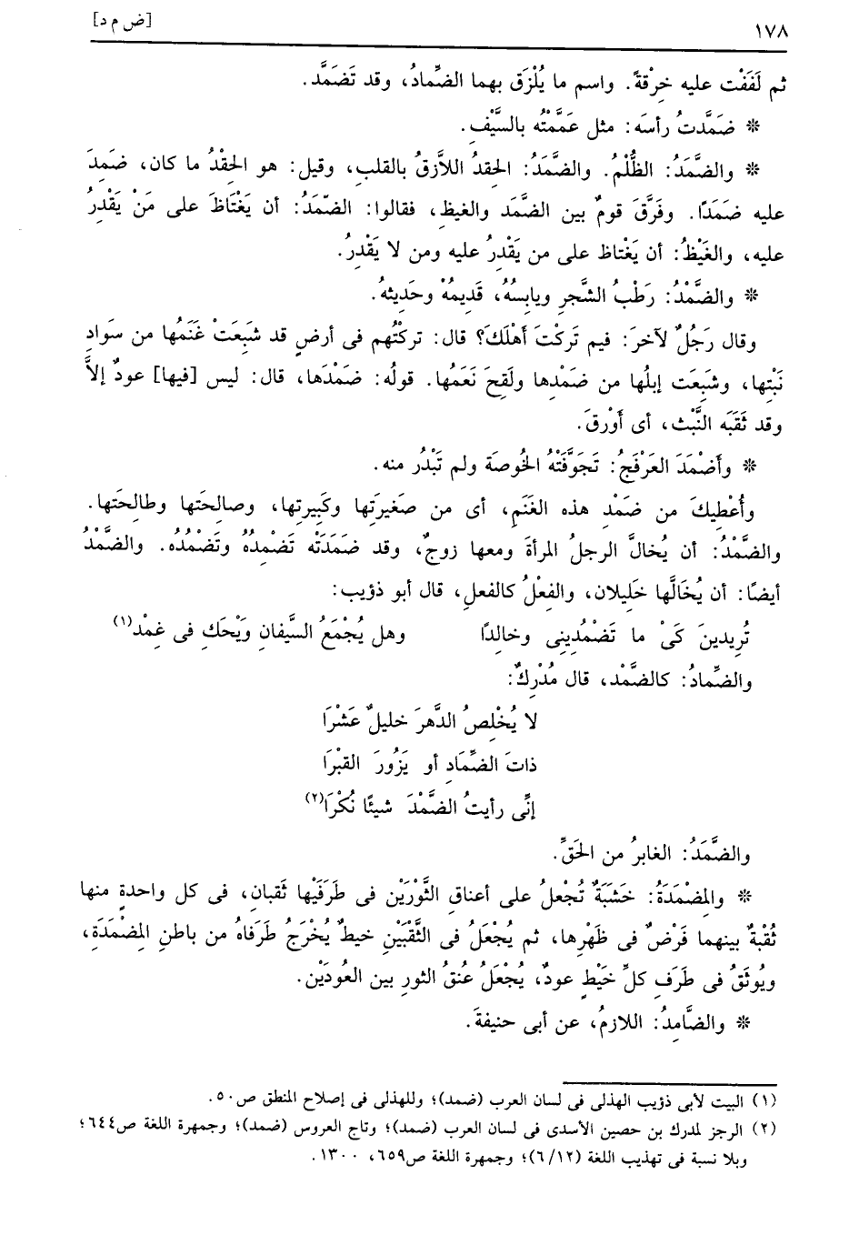 ثم لٌ فَفْت عليه خِرْقةً واسم ما يُلْزَق بها الضِّمادُ وقد تَضَمَّد ضَمَّدتُ رأسَه مثل عَمَّمْتُه بالسَّيْفِ والضَّمَدُ الظُّلْمُ والضَّمَدُ الحِقدُ اللازُّقُ بالقلبِ وقيل هو الحِقْدُ ما كان ضَمِدَ عليه ضَمَداً وفَرَّقَ قومٌ بين الضَّمَد والغيظِ فقالوا الضّمَدُ أن يَغْتَاظَ على مَنْ يَقْدِرُ عليه والغَيْظُ أن يَغْتاظ على من يَقْدِر عليه ومن لا يَقْدِرُ والضَّمْدُ رَطْبُ الشَّجرِ ويابِسُهُ قَدِيمُهْ وحَدِيثهُ وقال رَجُلٌ لآخرَ فيم تَركْتَ أَهْلَكَ قال تركْتُهم في أرضٍ قد شَبِعَتْ غَنَمُها من سَوادِ نَبْتِها وشَبِعَت إبلُها من ضِمْدِها ولَقِح نَعَمُها قولُه ضَمْدَها قال ليس فيها عودٌ إلاَّ وقد ثَقَبَه النَّبْث أي أَوْرقَ وأَضْمَدَ العَرْفَجُ تَجَوَّفَتْهُ الخُوصَة ولم تَبْدُر منه وأُعْطِيكَ من ضَمْدِ هذه الغَنَمِ أي من صَغيرَتِها وكَبِيرتِها وصالِحَتها وطالِحَتها والضَّمْدُ أن يُخالَّ الرجلُ المرأةَ ومعها زوجٌ وقد ضَمَدَتْه تَضْمِدُهُ وتَضْمُدُه والضَّمْدُ أيضاً أن يُخَالَّها خَلِيلان والفِعْلُ كالفعلِ قال أبو ذؤيب
