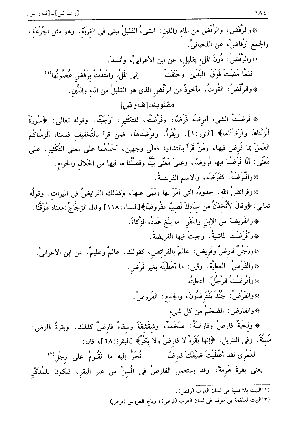 فَرضْتُ الشيء أفرِضهُ فَرْضاً وفَرَّضْتُه للتكْثيرِ أوْجَبْتُه وقوله تعالى {سورة أنزلناها وفرضناها} النور 1 ويُقْرأُ وفرَّضْناهَا فمن قرأ بالتَّخفيفِ فمعناه ألزمناكُم العَملَ بما فُرِضَ فيها ومَنْ قَرأَ بالتشديد فعلَى وجهين أحَدُهُما على معنى التَّكْثِير على مَعْنَى أنّا فَرَضْنَا فيها فُروضاً وعلى مَعْنَى بَيَّنَّا وفصَّلنا ما فيها من الحَلالِ والحرامِ وافْتَرَضَهُ كفَرَضَه والاسم الفريضةُ وفرائضُ اللهِ حدودهُ التي أمَرَ بها ونَهَى عنها وكذلك الفرايضُ في الميراثِ وقولهُ تعالى {وقال لأتخذن من عبادك نصيبا مفروضا} النساء 118 وقال الزجَّاجُ معناه مُؤَقَّتاً والفَريضة من الإِبلِ والبَقَرِ ما بلَغ عَددُه الزَّكاةَ وأفْرَضَتِ الماشيةُ وجَبتْ فيها الفريضةُ ورَجُلٌ فارِضٌ وفَرِيض عالمٌ بالفرائِضِ كقولك عالمٌ وعليمٌ عن ابن الأعرابيِّ والفَرْضُ العَطِيَّة وقيل ما أعْطَيْتَه بغير قَرْضٍ وأفْرضْتُ الرَّجُلَ أعطيتُه والفَرْضُ جُنْدٌ يَفْتَرِضُونَ والجمع الفُروضُ والفارض الضخمُ من كل شيءٍ ولِحْيَةٌ فارضٌ وفارضَةٌ ضَخْمَةٌ وشِقْشِقَةٌ وسِقاءٌ فارِضٌ كذلك وبقرةٌ فارض مُسِنَّةٌ وفي التنزيل {إنها بقرة لا فارض ولا بكر} البقرة 68 قال