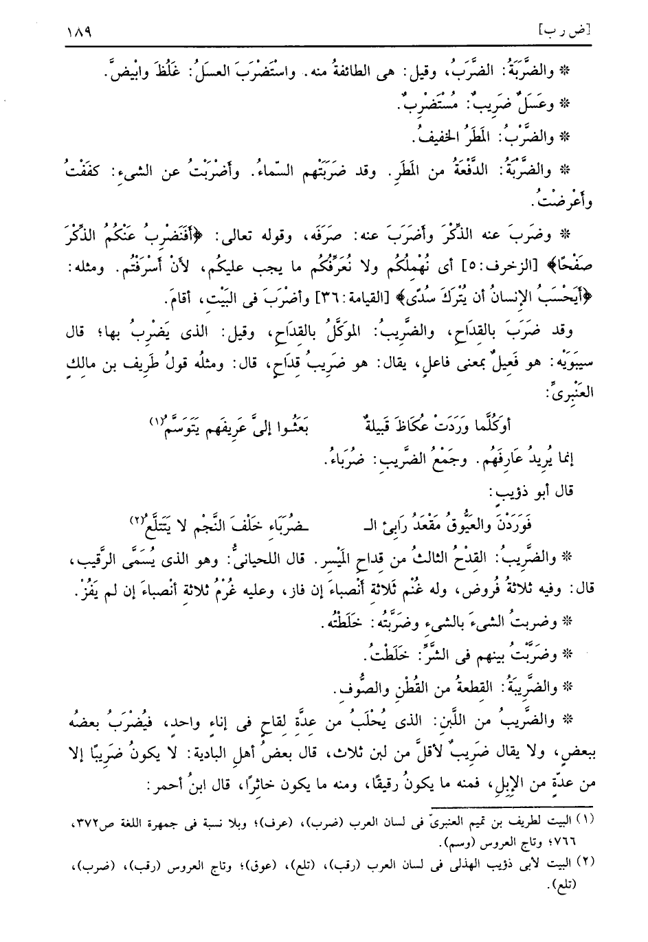 والضَّرَبَةُ الضَّرَبُ وقل هي الطائفةُ منه واسْتَضْرَبَ العسَلُ غَلُظَ وابْيضَّ وعَسَلٌ ضَرِيبٌ مُسْتَضْرِبٌ والضَّرْبُ المَطَرُ الخفيفُ والضَّرْبَةُ الدَّفعَةُ من المَطَرِ وقد ضَرَبَتْهم السّماءُ وأَضْرَبْتُ عن الشيءِ كفَفْتُ وأَعْرضْتُ وضَربَ عنه الذّكْرَ وأَضَرَبَ عنه صَرَفَه وقوله تعالى {أفنضرب عنكم الذكر صفحا} الزخرف 5 أي نُهْمِلُكُم ولا نُعَرِّفُكُم ما يجب عليكُم لأَنْ اَسْرَفْتثم ومثله {أيحسب الإنسان أن يترك سدى} القيامة 36 وأَضْرَبَ في البَيْتِ أقامَ وقد ضَرَبَ بالقِدَاح والضَّرِيبُ الموَكَّلُ بالقِدَاحِ وقيل الذي يَضْرِبُ بها قال سيبَوَيْه هو فَعِيلٌ بمعنى فاعلٍ يقال هو ضَرِيبُ قِدَاحٍ قال ومثلُه قولُ طَرِيف بن مالِكٍ العَنْبِريِّ
