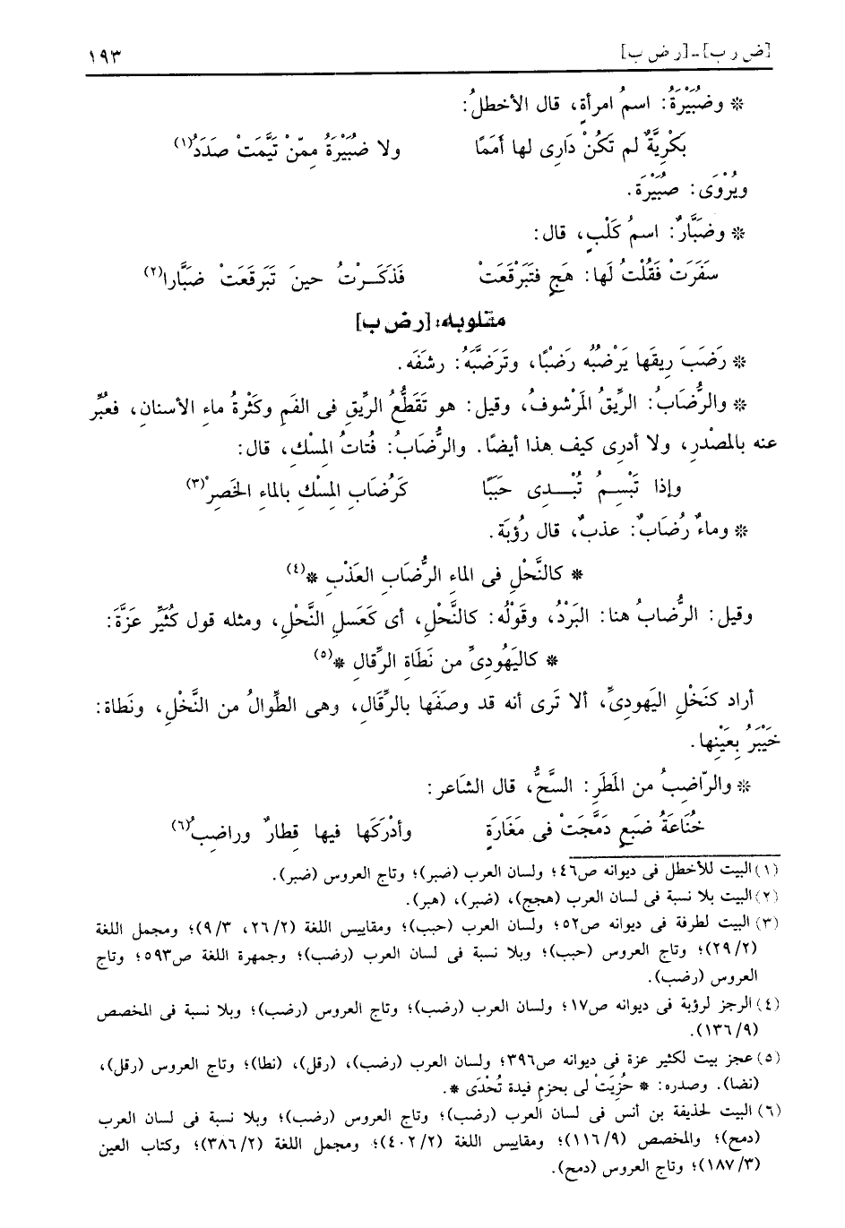 رَضَبَ رِيقَها يَرْضُبُه رَضْباً وتَرَضَّبَهُ رشَفَه والرُّضَابُ الرِّيقُ المَرْشوفُ وقيل هو تَقَطُّعُ الرِّيقِ في الفَمِ وكَثْرةُ ماءِ الأسنانِ فعُبِّر عنه بالمصْدرِ ولا أدرِي كيف هذا أيضاً والرُّضَابُ فُتاتُ المِسْكِ قال