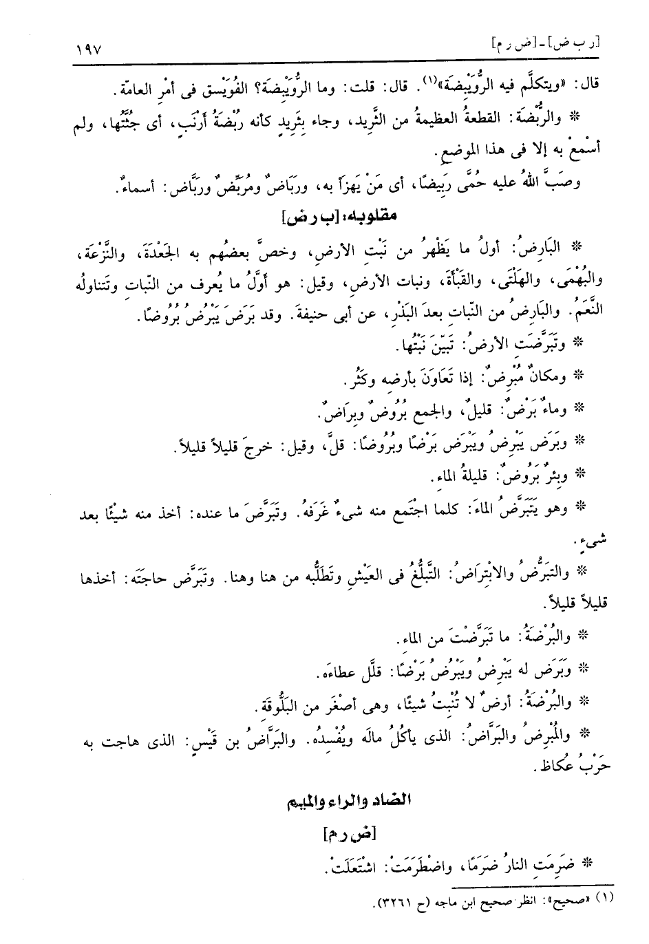 البَارِضُ أولُ ما يَظْهرُ من نَبْتِ الأرضِ وخصَّ بعضُهم به الجَعْدَةَ والنَّزْعَة والبُهْمَى والهَلْتَى والقَبْأَةَ ونبات الأرضِ وقيل هو أَوَّلُ ما يُعرف من النّباتِ وتَتناولُه النَّعَمُ والبَارِضُ من النّباتِ بعدَ البَذْرِ عن أبي حنيفةَ وقد بَرَضَ يَبْرُضُ بُرُوضاً وتَبَرَّضَتِ الأَرضُ تَبيّنَ نَبْتُها ومكانٌ مُبْرِضٌ إذا تَعَاوَنَ بأرضِه وكَثُر وماءٌ بَرْضٌ قليلٌ والجمعُ بُرُوضٌ وبِرَاضٌ وبَرَض يَبْرِضُ ويَبْرَض بَرْضاً وبُرُوضاً قلَّ وقيل خرجَ قليلاً قليلاً وبِئرٌ بَرُوضٌ قليلةُ الماءِ وهو يَتَبَرَّضُ الماءَ كلما اجْتَمع منه شيءٌ غَرَفهُ وتَبَرَّضَ ما عنده أخذ منه شيْئاً بعد شيءٍ والتَبَرُّضُ والابْتِرَاضُ التَّبلُّغُ في العَيْشِ وتَطَلُّبه من هنا وهنا وتَبَرَّض حاجَتَه أخذها قليلاً قليلاً والبُرْضَةُ ما تَبَرَّضْتَ من الماءِ وبَرَضَ له يَبْرِضُ ويَبْرُضُ بَرْضاً قلَّل عطاءَه والبُرْضَةُ أرضٌ لا تُنْبِتُ شيئاً وهي أصْغَر من البَلُّوقَةِ والمُبْرِضُ والبَرَّاضُ الذي يأكُلُ مالَه ويُفْسِدُه والبَرَّاضُ بن قَيْسٍ الذي هاجت به حَرْبُ عُكاظ