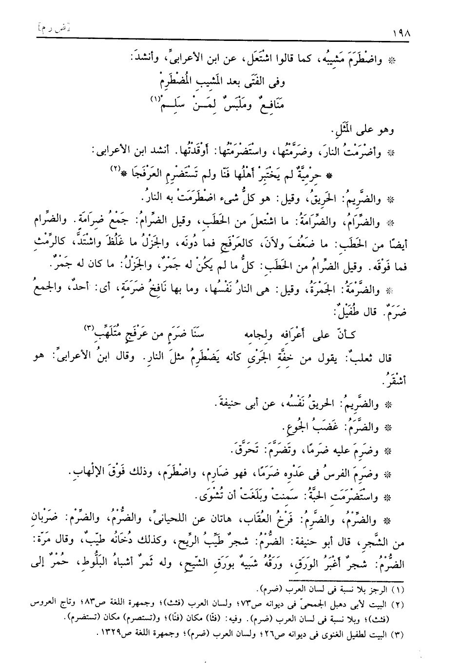 قال ثعلبٌ يقول من خِفَّةِ الجَرْيِ كأنه يَضْطَرِمُ مثلَ النارِ وقال ابنُ الأعرابيِّ هو أَشْقَرُ والضَّرِيمُ الحريقُ نَفْسُه عن أبي حنيفةَ والضَّرَمُ غَضَبُ الجُوعِ وضَرِمَ عليه ضَرَماً وتَضَرَّمَ تَحَرَّقَ وضَرِمَ الفرسُ في عَدْوِه ضَرَماً فهو ضَارِم واضْطَرَم وذلك فَوْقَ الإلْهابِ واسْتَضْرَمَتِ الحبَّةُ سَمِنتْ وبَلَغَتْ أن تُشْوَى والضِّرْمُ والضَّرِمُ فَرْخُ العُقَاب هاتان عن اللحيانيِّ والضُّرْمُ والضِّرْم ضَرْبانِ من الشَّجرِ قال أبو حنيفة الضُّرْمُ شجرٌ طَيِّبُ الرِّيح وكذلك دُخَانُه طيّبٌ وقال مَرّة الضُّرْمُ شجرٌ أَغْبَرُ الوَرَقِ وَرَقُهُ شَبيهٌ بوَرَقِ الشّيحِ وله ثَمرٌ أشباهُ البَلُّوطِ حُمْرٌ إلى