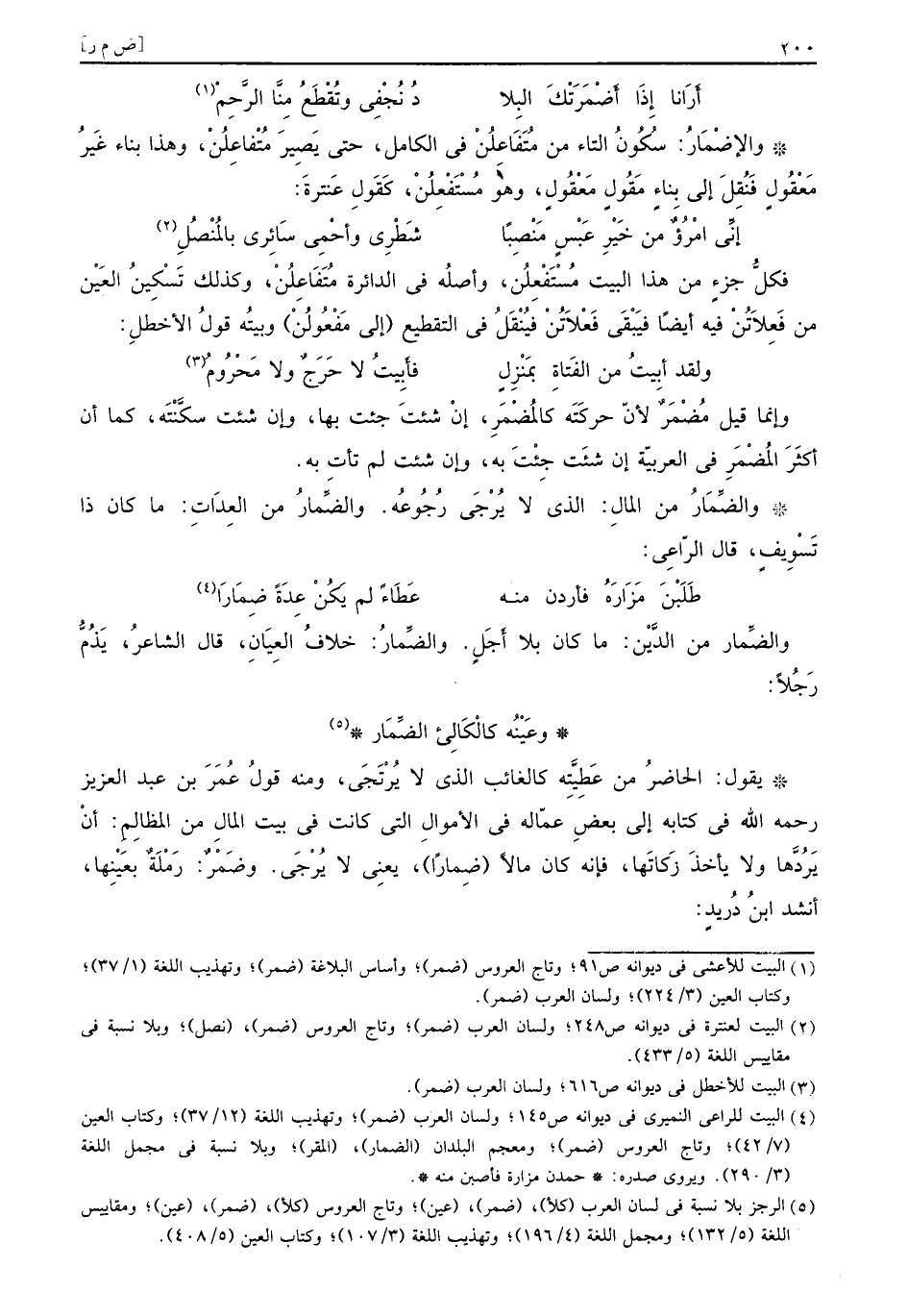 وإنما قيل مُضْمَرٌ لأنّ حركَتَه كالمُضْمَرِ إنْ شئتَ جئت بها وإن شئت سكَّنْتَه كما أن أكثَرَ المُضْمَرِ في العربيّة إن شئتَ جِئْتَ به وإن شئت لم تأتِ به والضِّمَارُ من المالِ الذي لا يُرْجَى رُجُوعُه والضِّمارُ من العِدَاتِ ما كان ذا تَسْوِيفٍ قال الرّاعِي