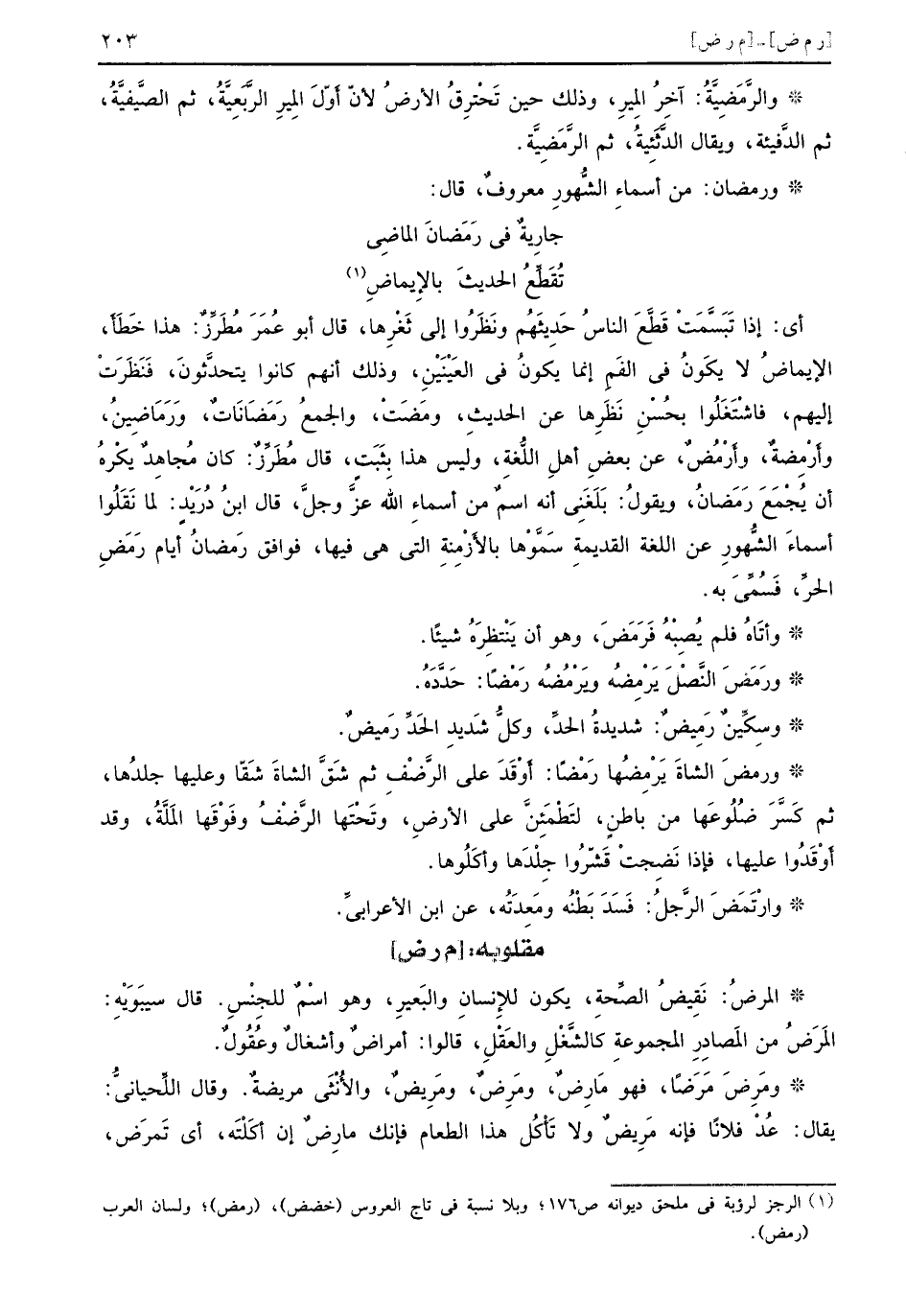 أي إذا تَبَسَّمَتْ قَطَّعَ الناسُ حَدِيثَهُم ونَظَرُوا إلى ثَغْرِها قال أبو عُمَرَ مُطَرَّزٌ هذا خَطَأ الإيماضُ لا يكَونُ في الفَمِ إنما يكونُ في العَيْنَيْنِ وذلك أنهم كانوا يتحدَّثونَ فَنَظَرَتْ إليهم فاشْتَعَلُوا بحُسْنِ نَظَرِها عن الحديثِ ومَضَتْ والجمعُ رَمَضَانَاتٌ وَرَمَاضِينُ وأَرْمِضةٌ وأَرْمُضٌ عن بعضِ أهلِ اللُّغةِ وليس هذا بِثَبَتٍ قال مُطَرِّزٌ كان مُجاهِدٌ يكْرهُ أن يُجْمَعَ رَمَضانُ ويقولُ بَلَغَنِي أنه اسمٌ من أسماءِ الله عزَّ وجلَّ قال ابنُ دُرَيْدٍ لما نَقَلُوا أسماءَ الشُّهورِ عن اللغة القديمةِ سَمَّوْها بالأَزْمِنةِ التي هي فيها فوافقَ رَمضانُ أيام رَمَضِ الحرِّ فَسُمِّيَ به وأتَاهُ فلم يُصبْهُ فَرَمَضَ وهو أن يَنْتَظِرَهُ شيئاً ورَمَضَ النَّصْلَ يَرْمِضُه ويَرْمُضهُ رَمْضاً حَدَّدَهُ وسِكِّينٌ رَمِيضٌ شديدةُ الحدِّ وكلُّ شَديدِ الحَدِّ رَميضٌ ورمضَ الشاةَ يَرْمِضُها رَمْضاً أَوْقَدَ على الرَّضْفِ ثم شَقَّ الشاةَ شَقّا وعليها جلدُها ثم كَسَّرَ ضُلُوعَها من باطنٍ لتَطْمِئنَّ على الأرضِ وتَحْتَهَا الرَّضْفُ وفَوْقَها المَلَّةُ وقد أَوْقَدُوا عليها فإذا نَضِجتْ قَشّرُوا جِلْدَها وأكَلُوها وارْتَمَضَ الرَّجلُ فَسَدَ بَطْنُهُ ومَعِدَتَهُ عن ابن الأعرابيِّ