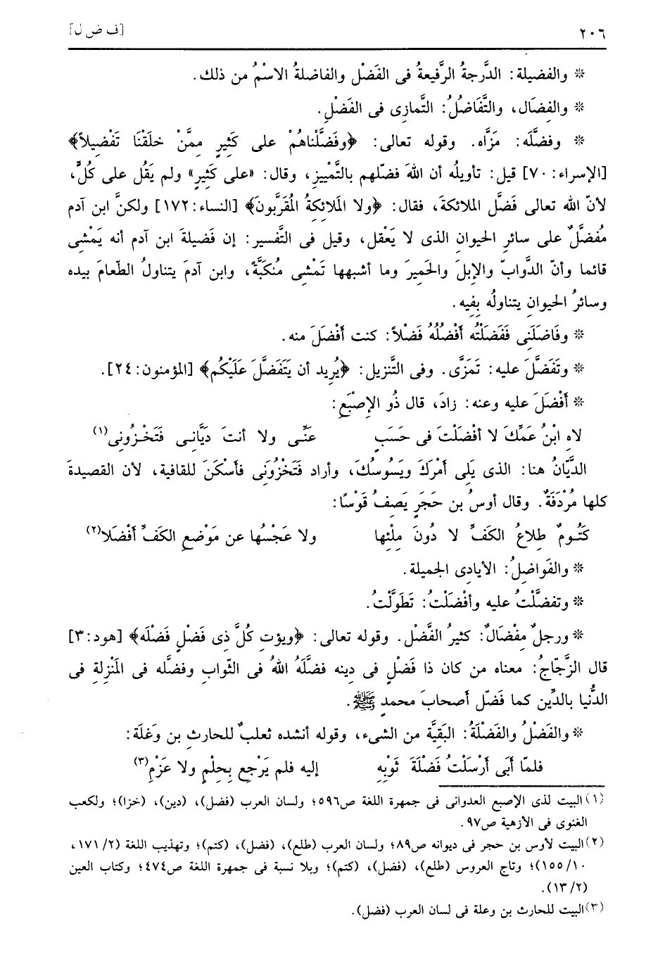 والفضيلة الدَّرجةُ الرَّفيعةُ في الفَضْل والفاضلةُ الاسْمُ من ذلك والفِضَال والتَّفَاضُلُ التَّمازِي في الفَضْلِ وفضَّلَه مَزَّاه وقوله تعالى {وفضلناهم على كثير ممن خلقنا تفضيلا} الاسراء 7 قيل تأويلُه أن اللهَ فضّلهم بالتَّمْييزِ وقال على كَثِيرٍ ولم يَقُل على كُلٍّ لأنّ الله تعالى فَضَّل الملائكةَ فقال {ولا الملائكة المقربون} النساء 172 ولكنَّ ابن آدم مُفضَّلٌ على سائِر الحيوانِ الذي لا يَعْقل وقيل في التَّفسير إن فَضيلةَ ابن آدم أنه يَمْشِي قائما وأنّ الدَّوابَ والإِبلَ والحَمِيرَ وما أشبهها تَمْشِي مُنكَبَّةً وابن آدمَ يتناولُ الطّعامَ بيده وسائرُ الحيوانِ يتناولهُ بِفِيهِ وفَاضَلَنِي فَفَصَلْتُه أَفْضُلُهُ فَضْلاً كنت أَفْضَلَ منه وتَفَضَّلَ عليه تَمَزَّى وفي التَّنزيل {يريد أن يتفضل عليكم} المؤمنون 24 أَفْضَلَ عليه وعنه زادَ قال ذُو الإِصْبَعِ