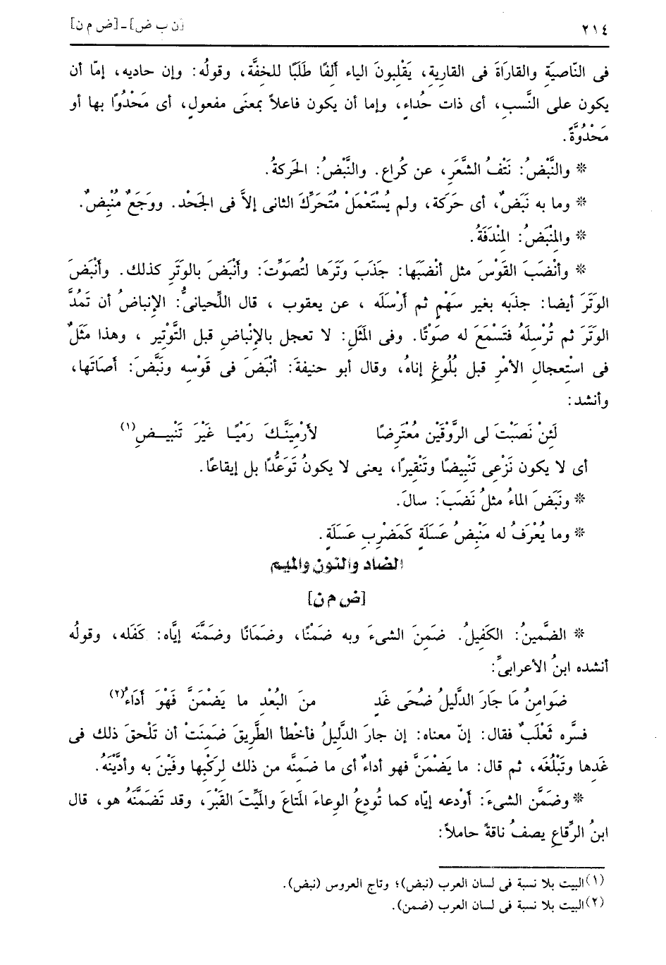 في النّاصِيَةِ والقارَاةَ في القارِيةِ يَقْلِبونَ الياء أَلِفاً طَلَباً للخِفَّةِ وقولُه وإن حاديه إمّا أن يكون على النَّسبِ أي ذات حُداءٍ وإما أن يكون فاعلاً بمعنَى مفعولٍ أن مَحْدُواً بها أو مَحْدُوَّةً والنَّبْضُ نَتْفُ الشَّعَرِ عن كُراع والنَّبْضُ الحَركةُ وما به نَبَضٌ أي حَرَكَة ولم يُسْتَعْمَلْ مُتَحَرِّكَ الثاني إلاًّ في الجَحْد ووَجَعٌ مُنْبِضٌ والمِنْبَضُ المِنْدَفَةُ وأنْضَبَ القَوْسَ مثل أنْضَبَها جَذَبَ وَتَرَها لتُصَوِّتَ وأًنْبَضَ بالوَتَرِ كذلك وأنبض الوَتَرَ أيضا جذَبه بغير سَهْمٍ ثم أَرْسَلَه عن يعقوب قال اللِّحيانيُّ الإِنْباضُ أن تَمُدَّ الوَتَرَ ثم تُرْسِلَهُ فَتَسْمَعَ له صَوْتاً وفي المَثَلِ لا تعجل بالإِنْباضِ قبل التَّوْتِير وهذا مَثَلٌ في اسْتِعجالِ الأمْرِ قبل بُلُوغِ إناهُ وقال أبو حنيفةَ أنْبَضَ في قَوْسِه ونَبَّضَ أَصَاتَها وأنشد