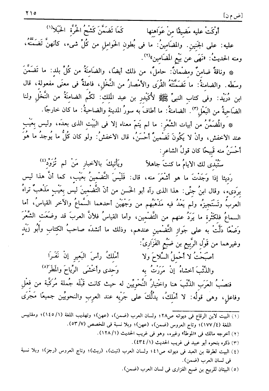 عليه على الجَنِينِ والمضَامِينُ ما في بُطونِ الحَوامِلِ من كُلِّ شيء كأنهنَّ تَضَمَّنَّهُ ومنه الحديثُ نَهَى عن بَيْعِ المَضَامِين وناقةٌ ضامِنٌ ومِضْمانٌ حاملٌ من ذلك أيضاً والضَامِنَةُ من كُلِّ بلدٍ ما تَضَمَّنَ وسَطَه والضامِنةُ ما تَضَمَّنَتْهُ القُرَى والأَمْصارُ من النَّخْلِ فاعِلةٌ في معنَى مفعولةٍ قال ابن دُرَيْد وفي كتابِ النبيِّ صلى الله عليه وسلم لأُكَيْدِرِ بن عبد المَلِكِ لكُم الضامِنَةُ من النَّخْلِ ولنا الضَاحِيةُ من البَعْلِ الضامنةُ ما أطافَ به سورُ المدينةِ والضاحيةُ ما كان خارجاً والمُضَمَّنُ من أبيات الشِّعْرِ ما لم يَتمّ معناه إلا في البَيْتِ الذي بعدَه وليس بِعَيْبٍ عند الأخفش وأنْ لا يَكُونَ تَضْمينٌ أَحْسَنُ قال الأخفشُ ولو كان كُلُّ ما يُوجدُ ما هُوَ أَحْسَنُ منه قَبِيحاً كان قولُ الشاعرِ