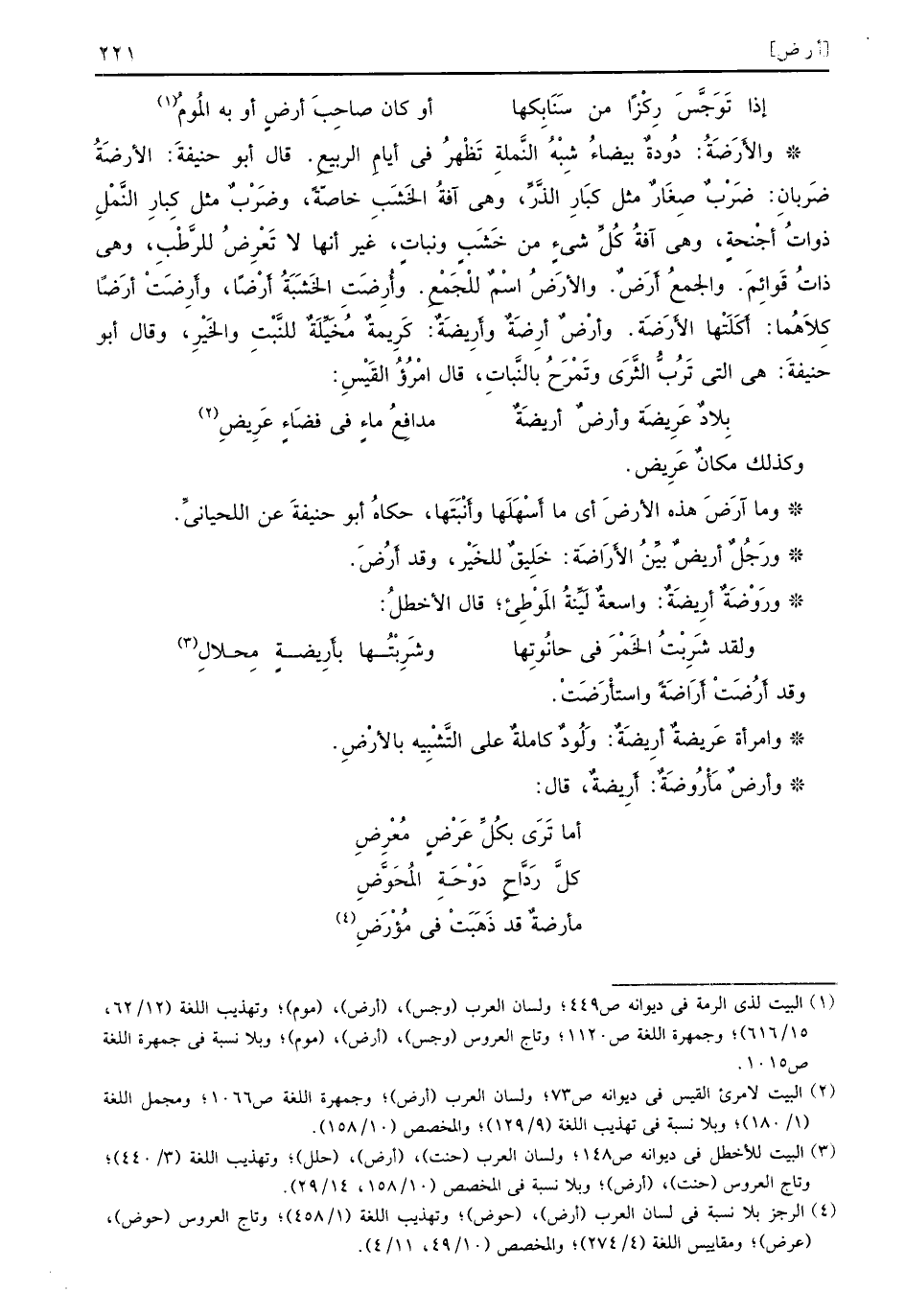 وكذلك مكانٌ عَرِيض وما آرَضَ هذه الأرضَ أي ما أَسْهَلَها وأَنْبَتَها حكاهُ أبو حنيفةَ عن اللحيانيِّ ورَجُلٌ أريضٌ بيِّنُ الأَرَاضَة خَلِيقٌ للخَيْر وقد أَرُضَ ورَوْضَةٌ أرِيضَةٌ واسعةٌ لَيِّنةُ المَوْطِئ قال الأخطلُ