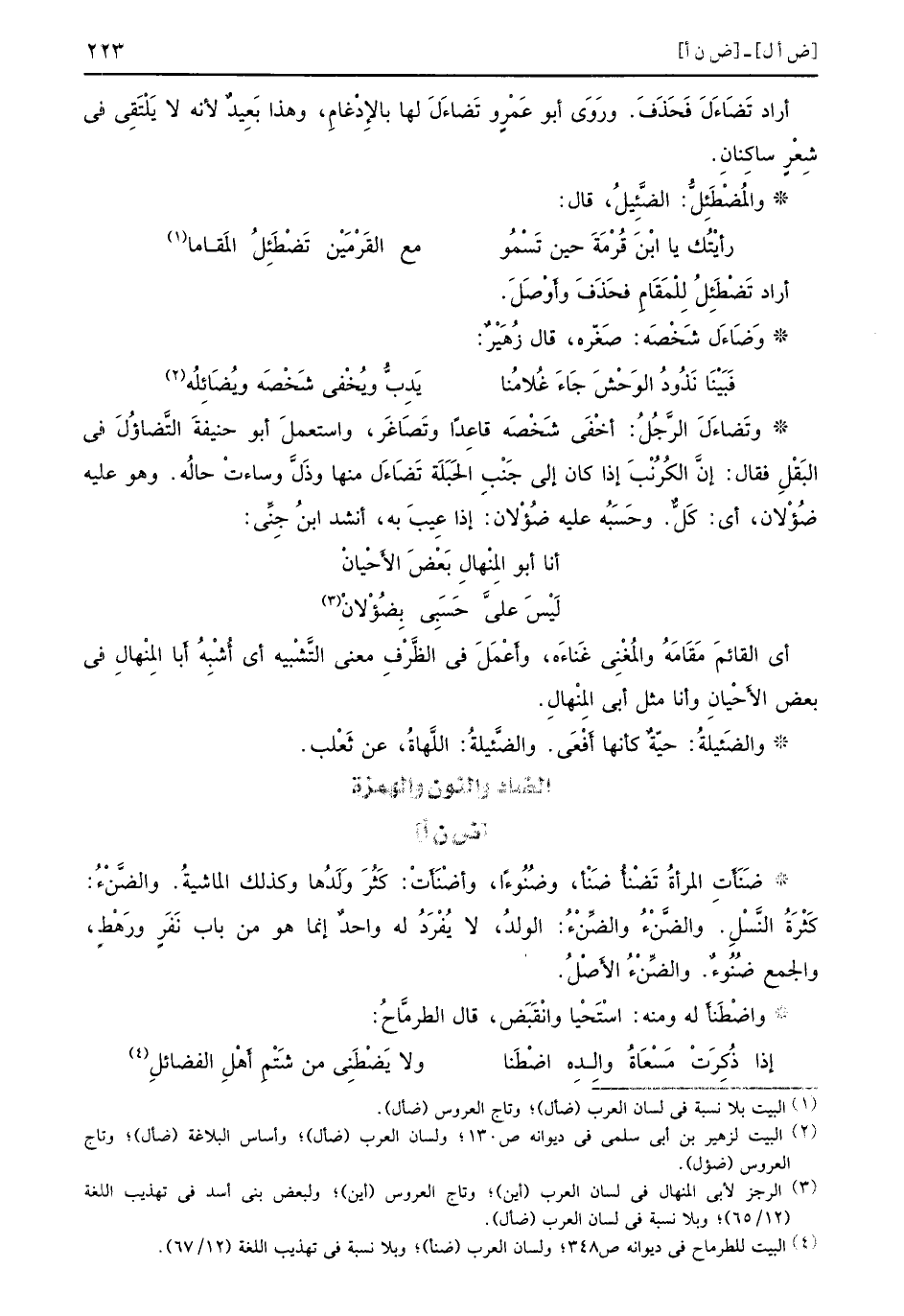 أراد تَضَاءَلَ فَحَذَفَ ورَوَى أبو عَمْروٍ تَضَاءَلَ لها بالإِدْغامِ وهذا بَعِيدٌ لأنه لا يَلْتَقِي في شِعْرٍ ساكِنانِ والمُضْطَئِلُّ الضَّئِيلُ قال