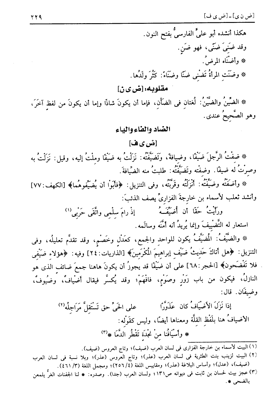 ضِفْتُ الرَّجلَ ضَيْفاً وضِيافةً وَتَضَيَّفْتُه نَزَلْتُ به ضَيْفاً ومِلْتُ إليه وقيل نَزَلْتُ به وصِرْتُ له ضيفاً وضِفْته وتَضَيَّفْتُه طلبتُ منه الضِّيافةَ وأضَفْتُه وضَيَّفْتُه أَنْزَلْتُه وقَرَّبْتُه وفي التنزيل {فأبوا أن يضيفوهما} الكهف 77 وأنشد ثعلب لأَسماء بن خارِجةَ الفزارِيِّ يصف الذئبَ