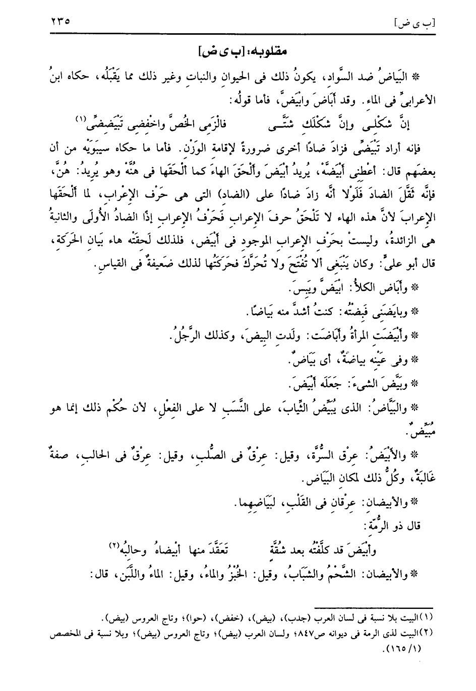 فإنه أراد تَبْيَضِّي فزادَ ضاداً أخرى ضرورةً لإقامةِ الوَزْنِ فأما ما حكاه سيبَوَيْه من أن بعضَهم قال أعْطِنِي أَبْيَضَّهْ يريد أبيض وأَلْحَقَ الهاءَ كما ألْحَقَتها في هُنَّهْ وهو يُرِيدُ هُنَّ فإنَّه ثَقَّلَ الضادَ فَلَوْلا أنَّه زادَ ضاداً على الضادِ التي هي حَرْف الإِعْرابِ لما أَلْحَقَها الإِعرابَ لأنَّ هذه الهاء لا تَلْحَقُ حرفَ الإِعْرابِ فَحَرْفُ الإِعرابِ إذاً الضادُ الأُولَى والثانيةُ هي الزائدةُ وليست بحَرْفِ الإِعرابِ الموجودِ في أَبْيَض فلذلك لَحِقَتْه هاء بَيانِ الحَرَكةِ قال أبو عليٍّ وكان يَنْبَغِي ألا تُفْتَحَ ولا تُحَرَّكَ فحَرَكتُها لذلك ضَعيفةٌ في القياسِ وأَبَاض الكلأُ ابْيَضَّ ويَبِسَ وبايَضَنِي فَبِضْتُه كنتُ أشدَّ منه بَياضاً وأَبْيَضَتِ المرأةُ وأَبَاضَت ولَدتِ البِيضَ وكذلك الرَّجُلُ وفي عَيْنِه بياضةٌ أي بَيَاضٌ وبَيَّضَ الشيءَ جَعَلَه أَبْيَضَ والبَيَّاضُ الذي يُبَيِّضُ الثِّيابَ على النَّسَبِ لا على الفِعْلِ لأن حُكْم ذلك إنما هو مُبْيِّضٌ والأَبْيَضُ عِرْق السُّرَّة وقيل عِرْقٌ في الصُّلبِ وقيل عِرْقٌ في الحالبِ صفةٌ غَالبَةٌ وكُلُّ ذلك لمكانِ البَيَاض والأبيضانِ عِرْقانِ في القَلْبِ لبَيَاضِهِما قال ذو الرُّمّةِ