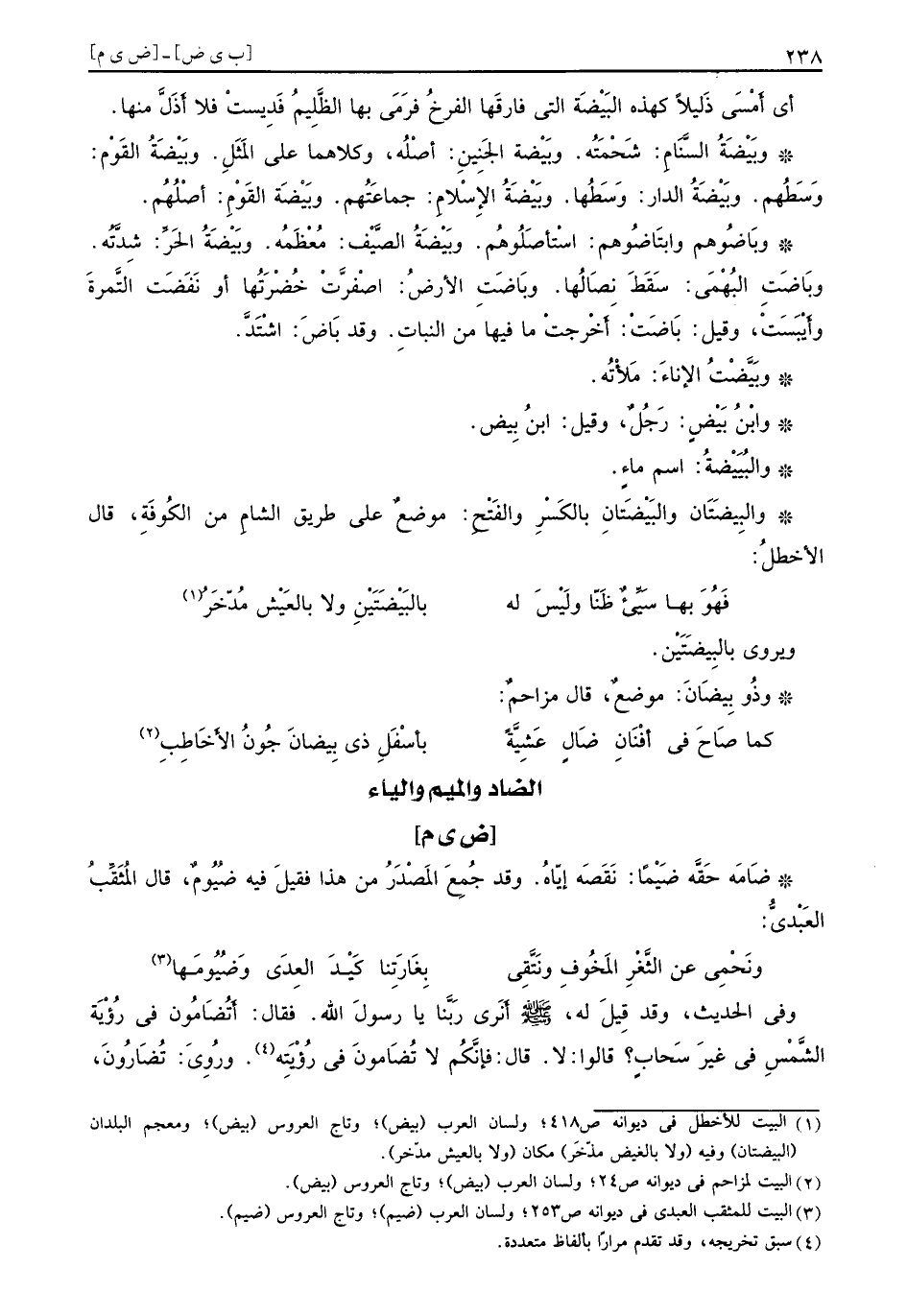 أي أَمْسَى ذَليلاً كهذه البَيْضَة التي فارقَها الفرخُ فرَمَى بها الظَّلِيمُ فَدِيسْتْ فلا أَذَلَّ منها وبَيْضَةُ السَّنَامِ شَحْمَتُه وبَيْضة الجَنِينِ أصْلُه وكلاهما على المَثَلِ وبَيْضَةُ القَوْم وَسَطُهم وبَيْضَةُ الدار وَسَطُها وبَيْضَةُ الإِسلامِ جماعَتُهم وبَيْضَة القَوْمِ أصْلُهُم وبَاضُوهم وابتَاضُوهم اسْتأصَلُوهُم وبَيْضَةُ الصَّيْف مُعْظَمَهُ وبَيْضَةُ الحَرِّ شِدَّتُه وبَاضَتِ البُهْمَى سَقَطَ نِصَالُها وبَاضَتِ الأرضُ اصْفَّرتْ خُضرَتُها أو نَفَضَت التَّمرةَ واَيْبَسَت وقيل بَاضَتْ أخْرجت ما فيها من النباتِ وقد بَاضَ اشْتَدَّ وبَيَّضْتُ الإناءَ مَلأتُه وابنُ بَيْضٍ رَجُلٌ وقيل ابنُ بِيض والبُيْيضَةُ اسم ماءٍ والبِيضَتَان والبَيْضَتانِ بالكَسْرِ والفَتْحِ موضعٌ على طريق الشامِ من الكُوفَةِ قال الأخطلُ