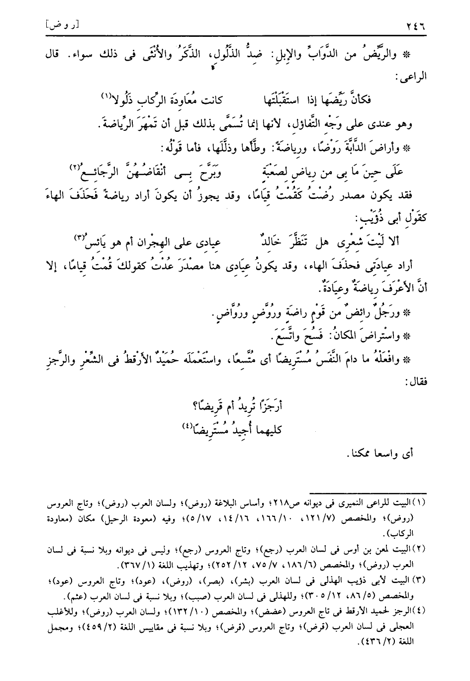 أراد عِيادَتي فحذَفَ الهاء وقد يكونُ عِيَادِي هنا مصْدَرَ عُدْتُ كقولكَ قُمْتُ قِياماً إلا أنَّ الأَعْرَفَ رِياضَةٌ وعِيَادَةٌ ورَجُلٌ رائِضٌ من قَوْمٍ راضَةٍ ورُوَّضٍ ورُوَّاضٍ واسْتراضَ المكانُ فَسُحَ واتَّسَعَ وافْعَلْهُ ما دامَ النَّفَسُ مُسْتَرِيضاً أي مُتَّسِعاً واسْتَعْمَلَه حُمَيْدٌ الأَرْقطُ في الشِّعْرِ والرَّجزِ فقال