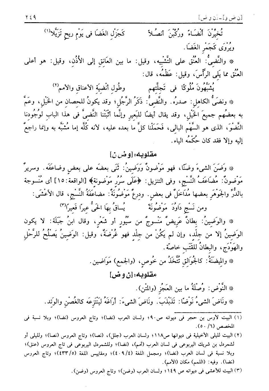 ويُرْوَى كَجَمْرِ الغَضَا والنَّضِيُّ العُنُق على التَّشْبِيه وقيل ما بين العَانِقِ إلى الأُذُنِ وقيل هو أعلى العُنُق مما يَلِي الرَّأْسَ وقيل عَظْمُه قال