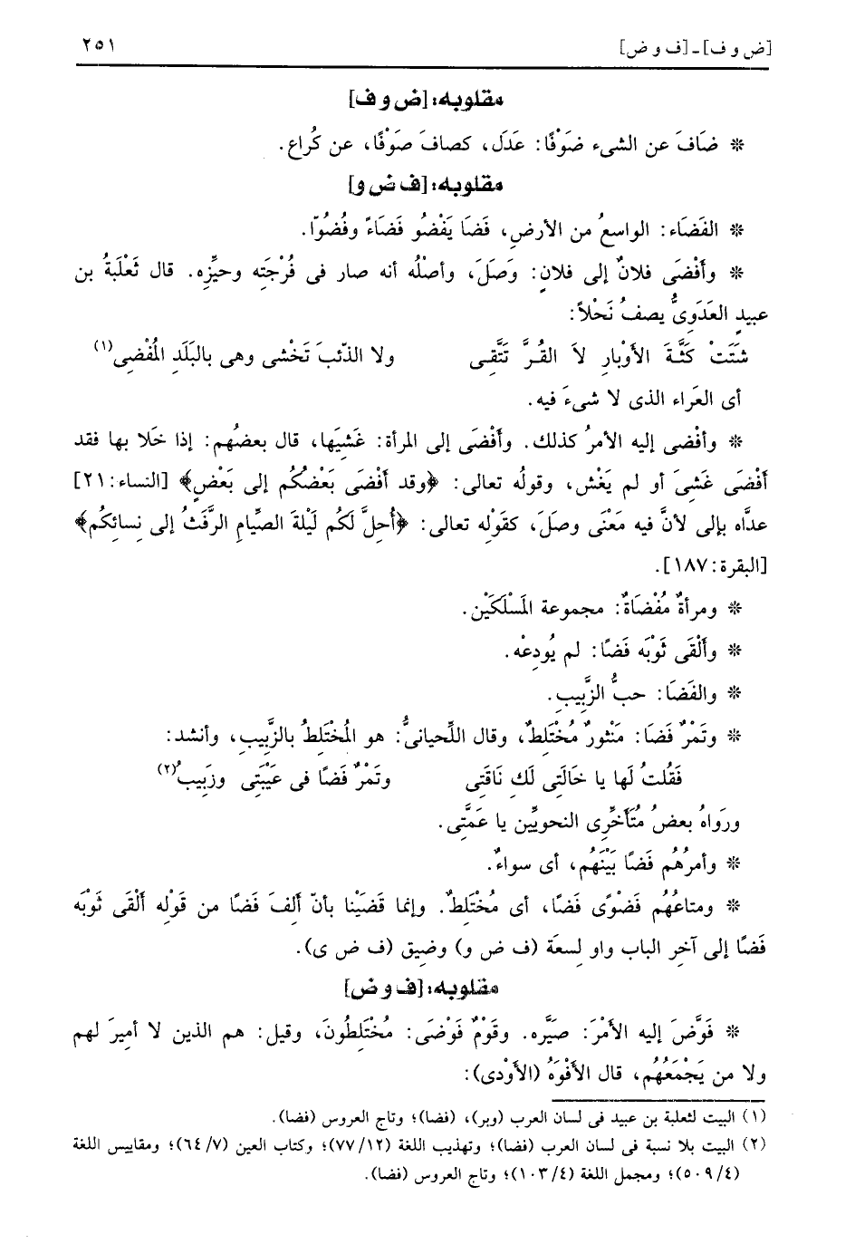 ورَواه بعضُ مُتَأَخِّرِي النحويِّين يا عَمَّتِي وأمرُهُم فَضاً بَيْنَهُم أي سواءٌ ومتاعُهُم فَضْوىً فَضاً أي مُخْتِلطٌ وإنما قَضَيْنَا بأنّ أَلِفَ فَضاً من قَوْلِه أَلْقَى ثَوْبَه فَضاً إلى آخِر الباب واو لِسعَة ف ض ووضِيق ف ض ي