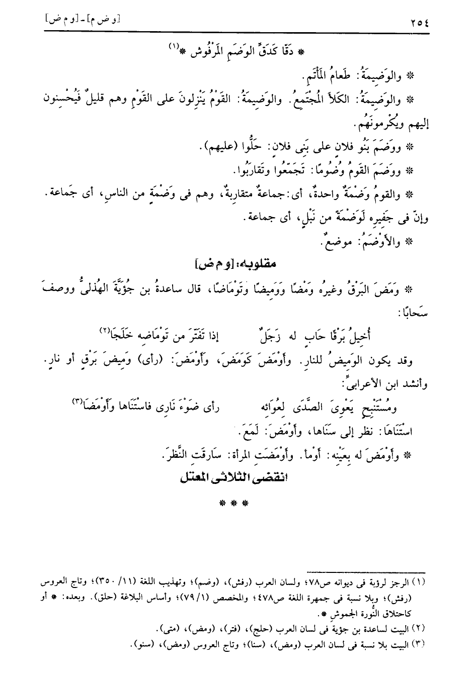 والوضيمة طعام المأتم والوَضِيمَةُ الكَلأَ المُجْتَمِعُ والوَضِيمَةُ القَوْمُ يَنْزِلونَ على القَوْمِ وهم قليلٌ فَيُحْسِنون إليهم ويُكْرمونَهُم ووَضَمَ بَنُو فلانٍ على بَنِي فلانٍ حَلُّوا عليهم ووَضَمَ القَوْمُ وُضُوماً تَجَمّعُوا وتَقَارَبُوا والقومُ وَضْمَةٌ واحدةٌ أي جماعةٌ متقاربةٌ وهم في وَضْمَةٍ من الناسِ أي جَماعة وإنّ في جَفِيرِه لَوَضْمَةً من نَبْلٍ أي جماعة والأَوْضَمُ موضعٌ