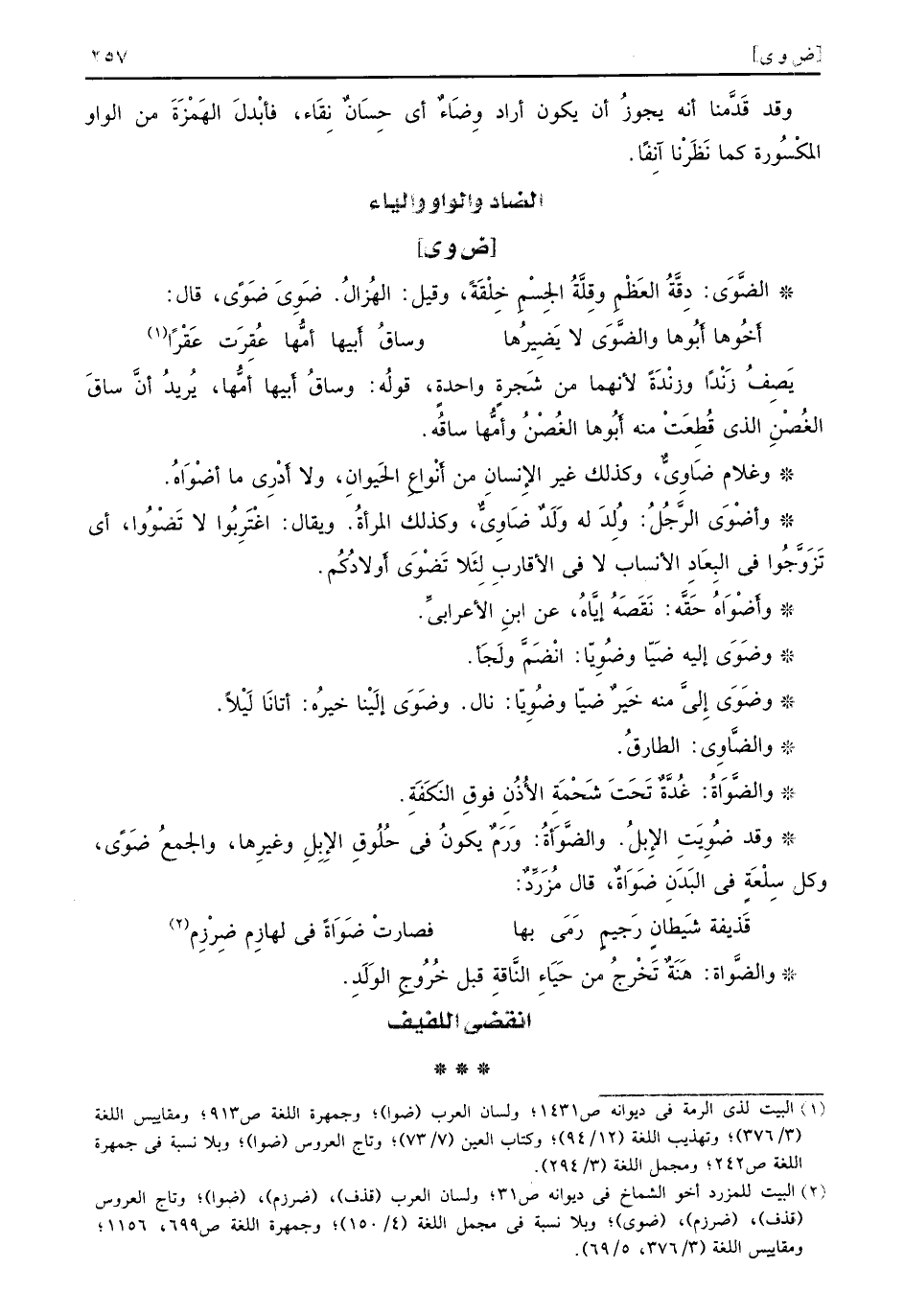 يَصِفُ زَنْداً وزنْدَةً لأنهما من شَجرةٍ واحدةٍ قولُه وساقُ أَبيها أمُّها يُريدُ أنَّ ساقَ الغُصْنِ الذي قُطِعَت منه أَبُوها الغُصْنُ وأمُّها ساقُه وغلام ضَاوِيٌّ وكذلك غير الإِنسانِ من أَنْواعِ الحَيوانِ ولا أَدْرِي ما أضْوَاهُ وأضْوَى الرَّجُلُ وُلِدَ له وَلَدٌ ضَاوِيٌّ وكذلك المرأةُ ويقال اغْتَرِبُوا لا تَضْوُوا أي تَزَوَّجُوا في البِعَادِ الأنساب لا في الأقاربِ لِئَلا تَضْوَى أَولادُكُم وأَضْوَاهُ حَقَّه نَقَصَهُ إيَّاهُ عن ابنِ الأعرابيِّ وضَوَى إليه ضَيّا وضُوِيّا انْضَمَّ ولَجَأ وضَوَى إِليَّ منه خَيرٌ ضيّا وضُويّا نال وضَوَى إلَيْنا خيرُه أتانَا لَيْلاً والضَّاوِي الطارقُ والضَّوَاةُ غُدَّةٌ تَحَتَ شَحْمَةِ الأُذُنِ فوقِ النَكَفَةِ وقد ضُوِيَتِ الإِبلُ والضَّوَأةُ وَرَمٌ يكونُ في حُلُوقِ الإِبِلِ وغيرِها والجمعُ ضَوىً وكل سِلْعَةٍ في البَدَنِ ضَوَاةٌ قال مُزَرِّدٌ
