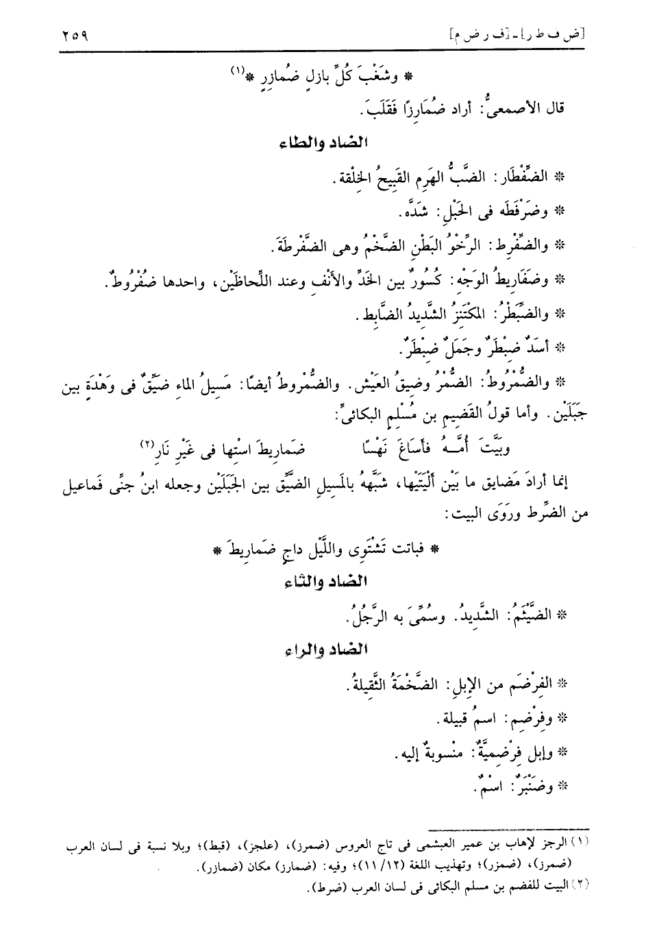 الضِّفْطَار الضَّبُّ الهَرِم القَبِيحُ الخِلْقة وضَرْفَطَه في الحَبْلِ شَدَّه والضِّفْرِط الرِّخْوُ البَطْنِ الضَّخْمُ وهي الضَّفْرطَةَ وضَفَارِيطُ الوَجْهِ كُسُورٌ بين الخَدِّ والأَنْفِ وعند اللِّحاظَيْن واحدها ضُفْرُوطٌ والضِّبَطْرُ المكْتَنِزُ الشَّدِيدُ الضَّابِط أسَدٌ ضِبْطَرٌ وجَمَلٌ ضِبْطَرٌ والضُّمْرُوطُ الضُّمْرُ وضِيقُ العَيْش والضُّمْروطُ أيضاً مَسِيلُ الماءِ ضَيِّقٌ في وَهْدَةٍ بين جَبَلَيْن وأما قولُ القَضِيمِ بن مُسْلِمٍ البكائيِّ