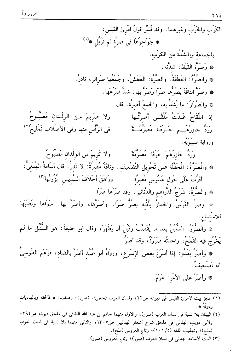 والصُّرَّةُ شَرَجُ الدَّراهِمِ والدَّنانيرِ وقد صَرَّها صَرّا وصرَّ الفَرَسُ والحمارُ بأُذُنِه يصُرُّ صَرّا وأصَرَّها وأصَرَّ بها سَوَّاها ونَصَبَها للاسْتِماعِ والصُّرَرُ السُّنْبُلُ بعد ما يُقَصَّبُ وقَبْلَ أن يَظْهَرَ وقال أبو حنيفةَ هو السُّنْبُل ما لم يَخْرُج فيه القَمْحُ واحدتُه صَرَرَةٌ وقد أصَرَّ وأصَرَّ يَعْدُو إذا أَسْرَعَ بعض الإِسْراعِ وروَاهُ أبو عُبَيْدٍ أضَرَّ بالضادِ فزَعَم الطُوسِيُّ أنه تَصْحيفٌ وأصَرَّ على الأَمْرِ عَزَمَ