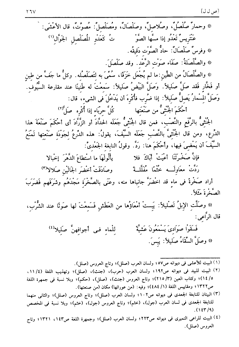 أراد صَخْرةً في ماءٍ قد اخْضَرَّ جانِباها منه وعَنَى بالصَّخْرَةِ مَجْدَهُم وشَرَفَهم فَضَرَبَ الصَّخْرةَ مَثَلاً وصَلَّتِ الإِبِلُ تَصْليلاً يَبِستْ أمْعَاؤُها من العَطَشِ فَسَمِعْتَ لها صَوتاً عند الشُّرْبِ قال الرَّاعِي