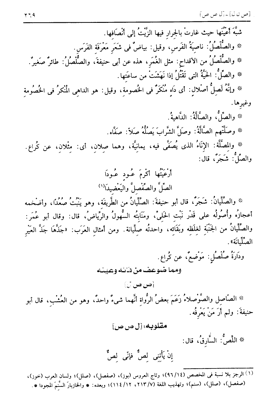 شبَّهَ أَعْيُنَها حيث غارتْ بالجِرارِ فيها الزَّيْتُ إلى أَنْصَافِها والصُّلْصُلُ ناصِيَةُ الفَرِس وقيل بياضٌ في شَعَرِ مَعْرَفَةِ الفَرَسِ والصُّلْصُلُ من الأقداحِ مثل الغُمَرِ هذه عن أبي حنيفةَ والصُّلْصُلُ طائرٌ صَغيرٌ والصِّلُّ الحَيَّةُ التي تَقْتُلُ إذا نَهَشَتْ من ساعَتِها وإنَّهُ لَصِلُّ أصْلالٍ أي دَاهٍ مُنْكَرٌ في الخُصومةِ وقيل هو الداهِي المُنْكُر في الخُصُومةِ وغيرِها والصِّلُّ والصَّالَّةُ الدَّاهيةُ وصَلَّتْهم الصَّالَّةُ وصَلَّ الشَّرابَ يَصُلُّهُ صَلاً صَفَّاه والمِصَّلَّة الإِنَاءُ الذي يُصَفَّى فيه يمانِيَّة وهما صِلانِ أي مِثْلانِ عن كُراع والصِّلُّ شَجَرٌ قال