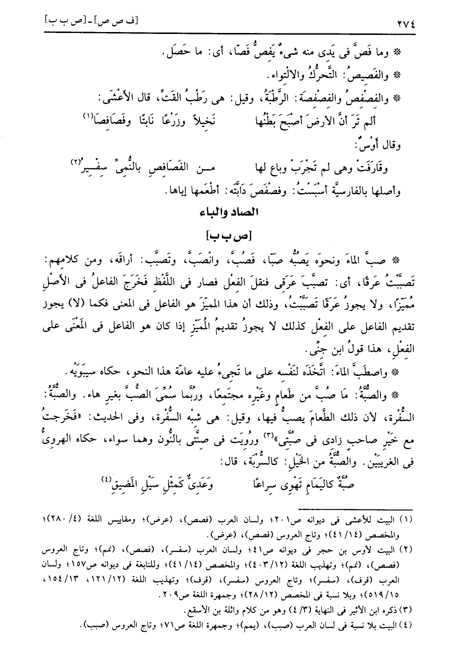 صبَّ الماءّ ونحوَه يَصُبُّه صَبّا فَصُبَّ وانْصَبَّ وتَصبَّب أراقَه ومن كلامِهم تَصبَّبْتُ عَرقاً أي تصبَّبَ عَرَقِي فنقلَ الفِعْل فصار في اللَّفْظِ فَخَرَجَ الفاعلُ في الأَصْلِ مُمَيّزاً ولا يجوزُ عَرَقاً تَصَبَّبْتُ وذلك أن هذا المميّزَ هو الفاعل في المعنى فكما لا يجوز تقديم الفاعل على الفِعْل كذلك لا يجوزُ تقديمُ المُمَيّزِ إذا كان هو الفاعل في المَعْنَى على الفِعْلِ هذا قولُ ابن جِنِّي واصطَبَّ الماءَ اتَّخّذَه لَنَفْسِه على ما تَجِئُ عليه عامّة هذا النحو حكاه سيبَوَيْه والصُّبَّةُ مَا صُبَّ من طَعامٍ وغَيْرِه مجتَمِعاً ورُبَّما سُمِّيَ الصُّبَّ بغيرِ هاء والصُّبَّةُ السُّفْرة لأن ذلك الطَّعامَ يصبُّ فيها وقيل هي شِبْه السُّفْرة وفي الحديث فَخَرجتُ مع خَيْرِ صاحبٍ زادِي في صُبَّتِي ورُوِيَت في صِنّتي بالنُّون وهما سواء حكاه الهروِيُّ في الغريبَيْن والصُّبَةُ من الخَيْلِ كالسُّرْبَة قال
