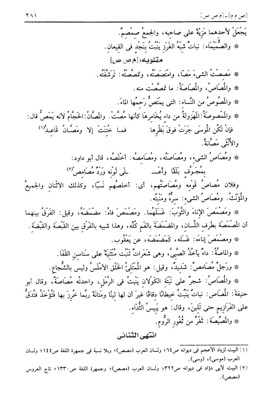 وفلان مُصاصُ قَوْمِه ومُصَاصَتُهم أي أخلصُهم نَسَباً وكذلك الاثْنانِ والجميعُ والمُؤَنّثُ ومَصَاصُ الشيءِ سِرُّهُ ومَنْبِتُه ومَصْمَصَ الإِناءَ والثَّوْبَ غَسَلَهُما ومَصْمَصَ فاهُ مضْمَضَهُ وقيل الفَرْقُ بينهما أن المَصْمَصَة بطَرفِ اللَّسانِ والمضْمَضَةَ بالفَمِ كُلِّه وهذا شبيه بالفَرْقِ بين القَبْصَة والقَبْضَةِ ومصْمَصَ إناءَه غَسَله كَمَضْمَضه عن يَعْقُوب والماصَّةُ داءٌ ياخُذُ الصَّبِيَّ وهي شَعَراتٌ تَنْبُت مُنْثَنِيَةً على سَناسِنِ القَفَا ورَجلٌ مُصَامِصٌ شَدِيدٌ وقيل هو المُمْتَلِئُ الخَلْق الأمْلَسُ وليس بالشُّجاعِ والمُصَاصُ شجرٌ على نَبْتَةِ الكَوْلانِ يَنْبتُ في الرَّمْلِ واحدُته مُصَاصَةٌ وقال أبو حنيفةَ المُصَاص نباتٌ يَنْبُتُ خِيطاناً دِقاقاً غيرَ أن لها لِيناً ومَتانَةً ربَّما خُرِزَ بها فَتُؤْخَذُ فتُدَقُّ على الفَرَازِيمِ حتى تَلِينَ وقال هو يَبِيسُ الثُّدّاءِ والمَصِّيصَة ثَغْرٌ من ثُغُورِ الرُّومِ