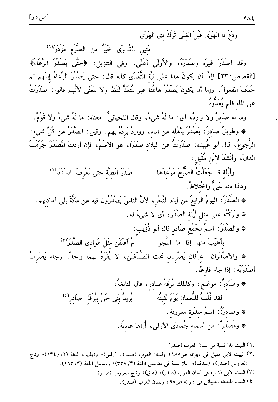 وهذا منه عَييٌّ واختِلاطٌ الصَّدْرُ اليومُ الرابعُ من أيام النَّحْرِ لأنَّ الناسَ يَصْدُرُون فيه عن مكَّةَ إلى أماكِنِهم وتَرَكْتُه على مِثْلِ لَيْلةِ الصَّدَر أي لا شيءَ له والصَّدَرُ اسمٌ لِجَمْعِ صَادرٍ قال أبو ذُؤَيبٍ