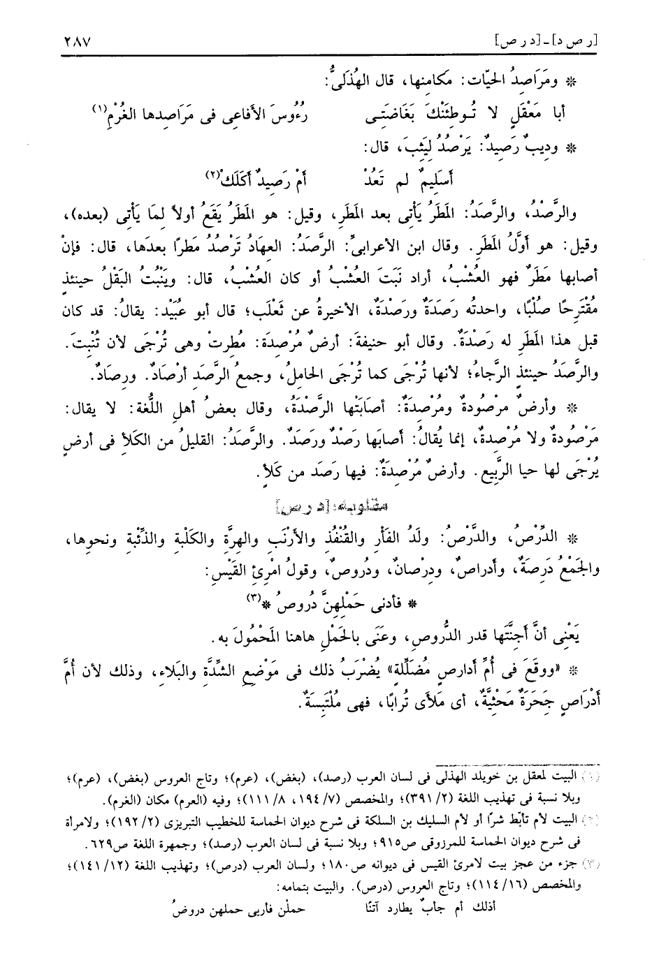 والرَّصْدُ والرَّصَدُ المَطَرُ يَأْتِي بعد المَطَرِ وقيل هو المَطَرُ يَقَعُ أولاً لَمَا يَأْتِي بعده وقيل هو أَوَّلُ المَطَرِ وقال ابن الأعرابيِّ الرَّصَدُ العِهَادُ تَرْصُدُ مَطراً بعدَها قال فإنْ أصابها مَطَرٌ فهو العُشْبُ أراد نَبَتَ العُشْبُ أو كان العُشْبُ قال ويَنْبُتُ البَقْلُ حينئذٍ مُقْتَرِحاً صُلْباً واحدُته رَصَدَةٌ ورَصْدَةٌ الأخيرةُ عن ثَعْلَب قال أبو عُبَيْد يقالُ قد كان قبل هذا المَطَرِ له رَصْدَةٌ وقال أبو حنيفةً أرضٌ مُرْصِدَة مُطِرتْ وهي تُرْجَى لأن تُنْبِتَ والرَّصَدُ حينئذٍ الرَّجاءُ لأنها تُرْجَى كما تُرْجَى الحامِلُ وجمعُ الرَّصَدِ أرْصَادٌ ورِصَادٌ وأرضٌ مرْصُودةٌ ومُرْصِدَةٌ أصَابَتْها الرَّصْدَةُ وقال بعضُ أهلِ اللُّغة لا يقال مَرْصُودةٌ ولا مُرْصِدةٌ إنما يُقالُ أَصابَها رَصْدٌ ورَصَدٌ والرَّصَدُ القليلُ من الكَلأِ في أرضٍ يُرْجَى لها حيا الرَّبِيع وأرضٌ مُرْصِدَةٌ فيها رَصَد من كَلأٍ