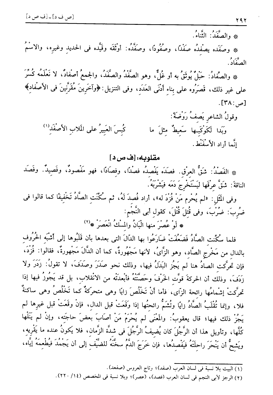 فلما سُكِّنتِ الصَّادُ فَضَعُفَتْ ضَارَعُوا بها الدّالَ التي بعدها بأن قَلَبُوها إلى أَشْبَهِ الحُرُوف بالدالِ من مَخْرجِ الصَّادِ وهو الزَّايُ لأنها مَجْهُورةٌ كما أن الدَّالَ مَجْهورةٌ فقالوا فُزْدَ فإن تحرَّكتِ الصادُ هنا لم يَجُز البَدَلُ فيها وذلك نحو صَدَرَ وصَدَفَ لا تقولُ زَدَرَ ولا زَدَفَ وذلك أن الحركةَ قوَّتِ الحَرْفَ وحَصَّنْتْهُ فأبْعدَتْه من الانْقلابِ بل قد يَجُوزُ فيها إذا تحرَّكتْ إشْمامُها رائِحة الزّاي فأما أَنْ تَخْلُصَ زاياً وهي متحرّكةٌ كما تَخْلُصُ وهي ساكنةٌ فلا وإنما تُقْلَبُ الصَّادُ زاياً وتُشَمُّ رائِحتُها إذا وَقَعَتْ قبل الدالِ فإنْ وقَعَتْ قبل غيرِها لم يَجُزْ ذلك فيها قال يعقوبُ والمَعْنَى لم يُحْرَمْ مَنْ أصَابَ بعضَ حاجَتِه وإنْ لم يَنَلْها كُلَّها وتأويل هذا أن الرَّجُلَ كان يُضِيفُ الرَّجُلَ في شِدَّةِ الزَّمانِ فلا يَكونُ عنده ما يَقْرِيهِ ويَشِحُّ أن يَنْحَرَ راحِلَتَهُ فيَفْصِدُها فإن خَرَجَ الدَّمُ سخَّنَهُ للضَّيْفِ إلى أن يَجْمَدَ فيُطْعِمَهُ إيَّاه