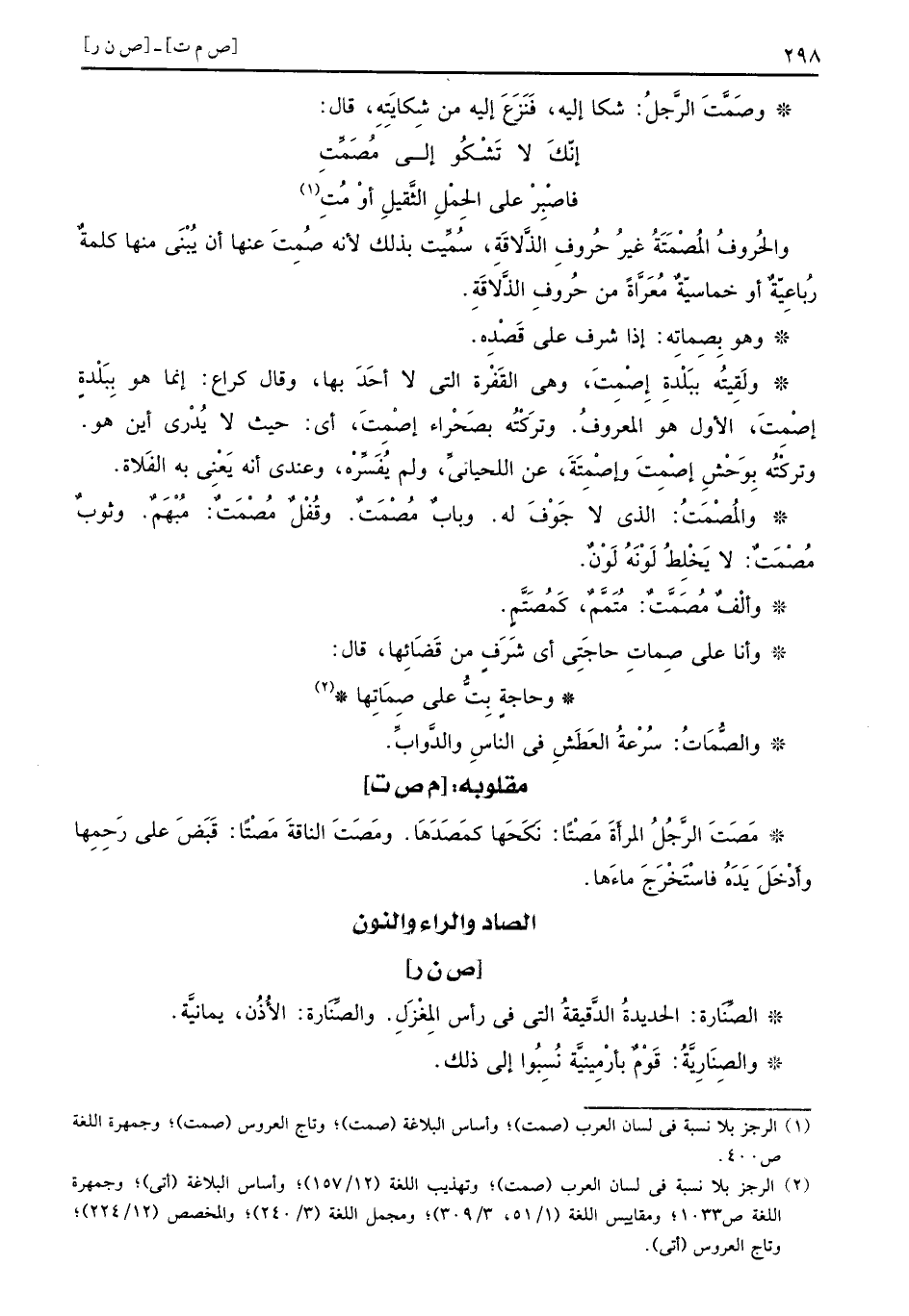 والحُروفُ المُصْمَتَةُ غيرُ حُروفِ الذَّلاقَةِ سُمِّيت بذلك لأنه صُمِتَ عنها أن يُبْنَى منها كلمةٌ رُباعِيّةٌ أو خماسيّةٌ مُعَرَّاةً من حُروفِ الذَّلاقَةِ وهو بِصِماتِه إذا شرف على قَصْدِه ولَقِيتُه ببَلْدةِ إِصْمِتَ وهي القَفْرة التي لا أحَدَ بها وقال كراع إنما هو بِبَلْدَةٍ إصْمِتَ الأول هو المعروفُ وترَكْتُهُ بصَحْراء إصْمِتَ أي حيث لا يُدْرى أين هو وتركْتُه بِوَحْشِ إصْمِتَ وإصْمِتَةَ عن اللحيانيِّ ولم يُفَسِّرْه وعندي أنه يَعْنِي به الفَلاة والمُصْمَتُ الذي لا جَوْفَ له وبابٌ مُصْمَتٌ وقُفْلٌ مُصْمَتٌ مُبْهَمٌ وثوبٌ مُصْمَتٌ لا يَخْلِطُ لَوْنَهُ لَوْنٌ وألْفٌ مُصَمَّتٌ مُتَمَّمٌ كَمُصَتَّمٍ وأنا على صِماتِ حاجَتِي أي شَرَفٍ من قَضَائِها قال