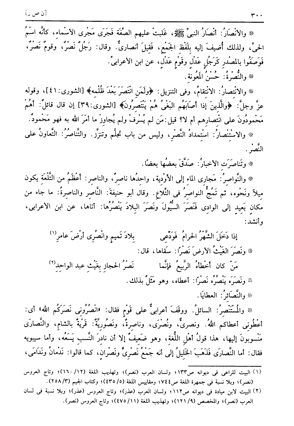 والأنْصَارُ أنْصَارُ النبيِّ صلى الله عليه وسلم غَلبتْ عليهم الصِّفَة فَجَرَى مَجْرى الأسْماءِ كأنَّه اسْمُ الحيِّ ولذلك أُضِيفَ إليه بِلَفْظِ الجَمْعِ فَقِيلَ أنصاريٌّ وقال رَجُلٌ نَصْرٌ وقومٌ نَصْرٌ فَوَصَفُوا بالمَصْدَرِ كَرَجُلٍ عَدْلٍ وقَوْمٍ عَدْلٍ عن ابن الأعرابيِّ والنُّصْرةُ حُسْنُ المَعُونةِ والانْتِصارُ الانْتِقامُ وفي التنزيل {ولمن انتصر بعد ظلمه} الشورى 41 وقوله عزَّ وجلَّ {والذين إذا أصابهم البغي هم ينتصرون} الشورى 39 إن قال قائلٌ أَهُمْ مَحْمودُونَ على انْتِصارِهم أم لا قيل مَن لم يُسْرفْ ولم يُجاوِزْ ما أمَرَ الله به فهو مَحْمودٌ والاسْتِنْصارُ اسْتِمدادُ النَّصْرِ وليس من باب تجلَّم وتنزَّر والتَّناصُرُ التَّعاونُ على النَّصْر وتَناصَرَتِ الأخبارُ صَدَّقَ بعضُها بعضاً والنَّواصِرُ مَجارِي الماءِ إلى الأَوْدِية واحِدُها ناصِرٌ والناصِر أَعْظَمُ من التَّلْعَةِ يكون مِيلاً ونَحْوه ثم تَمُجُّ النواصِرُ في التِّلاعِ وقال أبو حنيفةَ النَّاصِر والناصِرةُ ما جاء من مكانٍ بَعيدٍ إلى الوادِي فَنَصَرَ السُّيُولَ ونَصَرَ البِلادَ يَنْصُرُها أتاها عن ابن الأعرابي وأنشد