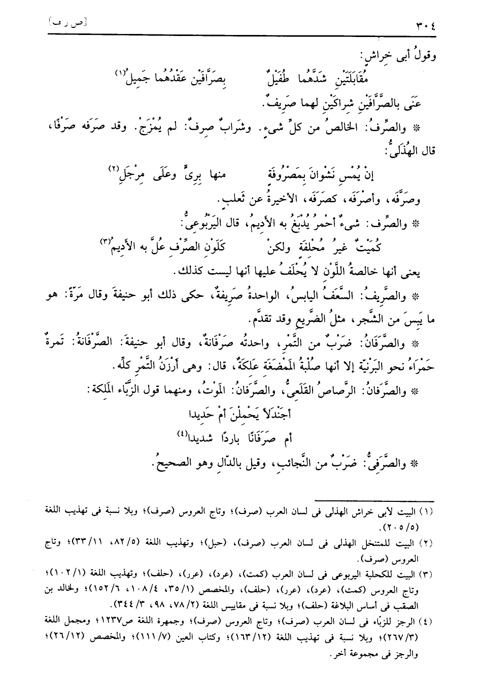 يعني أنها خالصةُ اللَّوْنِ لا يُحْلَفُ عليها أنها ليست كذلك والصَّرِيفُ السَّعَفُ اليابسُ الواحدةُ صَرِيفةٌ حكى ذلك أبو حنيفةَ وقال مَرّةً هو ما يَبِسَ من الشَّجر مثلُ الضَّريعِ وقد تقدَّم والصَّرَفَانُ ضَرْبٌ من التَّمرِ واحدتُه صَرْفَانةٌ وقال أبو حنيفةَ الصَّرْفَانةُ تَمرةٌ حَمْرَاءُ نحو البَرْنيّة إلا أنها صُلْبةُ المَمْضَغَةِ عَلِكَةٌ قال وهي أَرْزَنُ التَّمْرِ كلِّه والصَّرَفانُ الرَّصاصُ القَلَعِيُّ والصَّرَفانُ المَوْتُ ومنهما قول الزَّبّاء المَلِكة